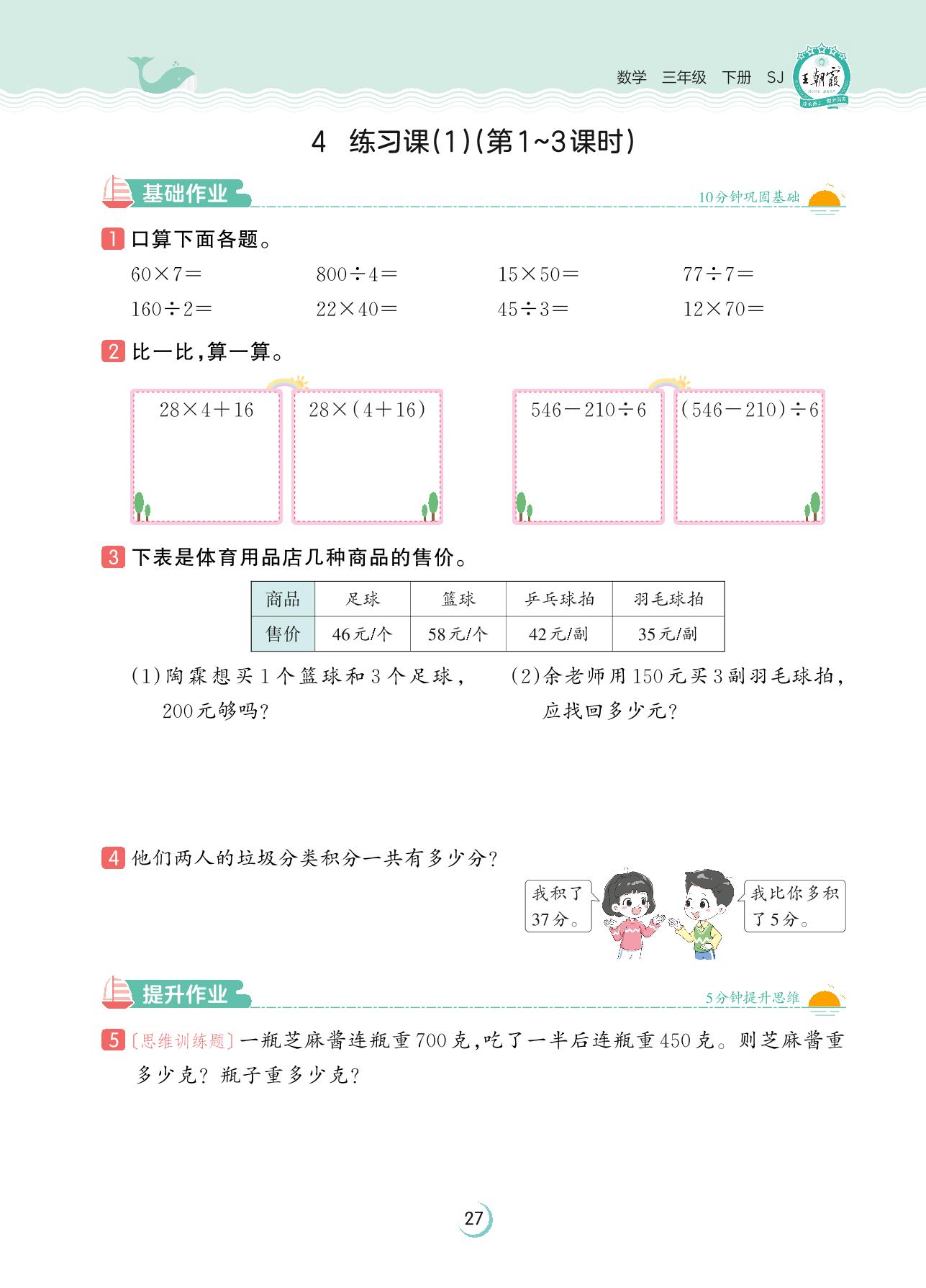 2023下册三年级数学苏教版 第四单元 混合运算——4 练习课(1)(第1~3课时)