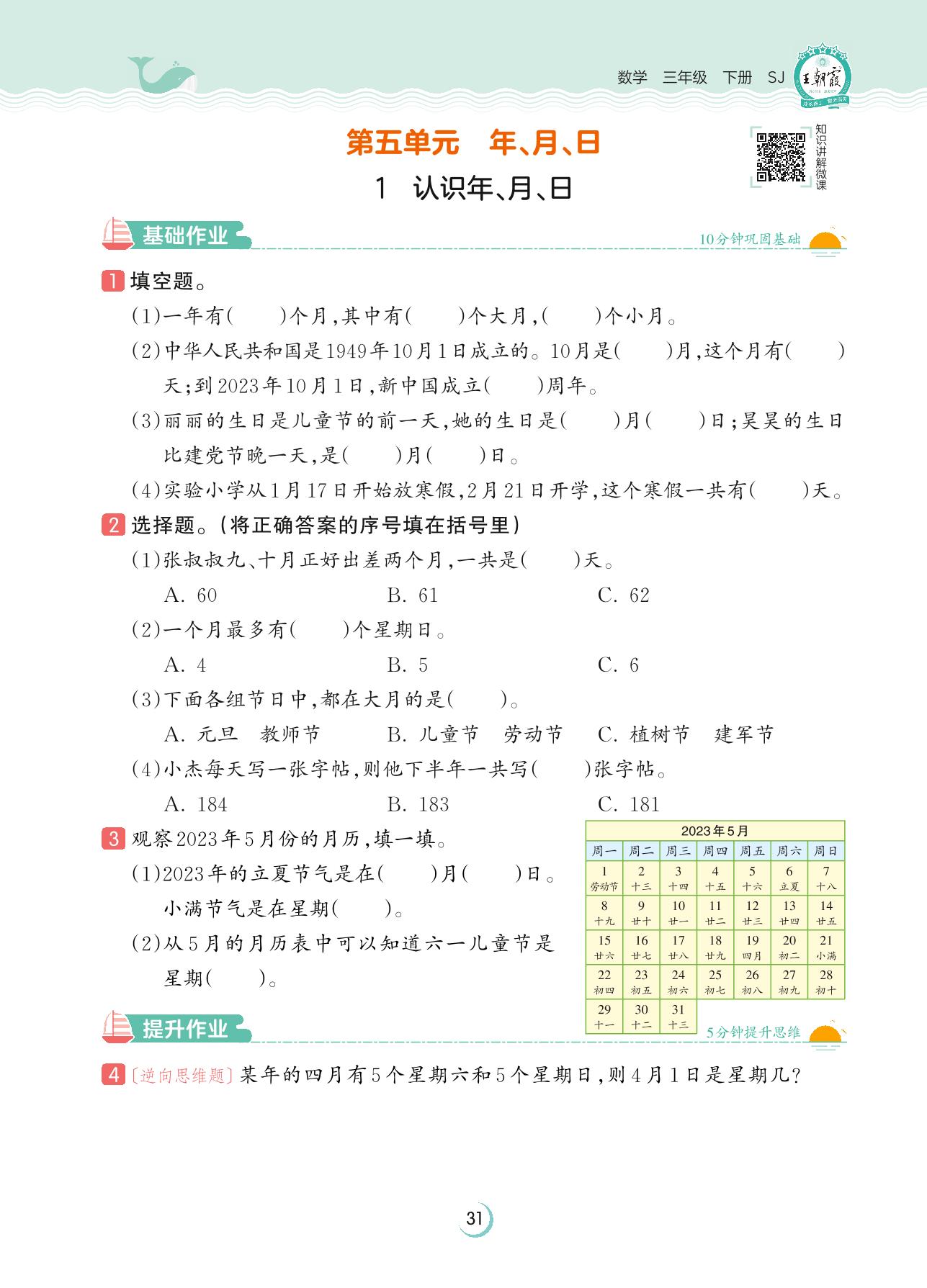 2023下册三年级数学苏教版 第五单元 年、月、日——1 认识年、月、日
