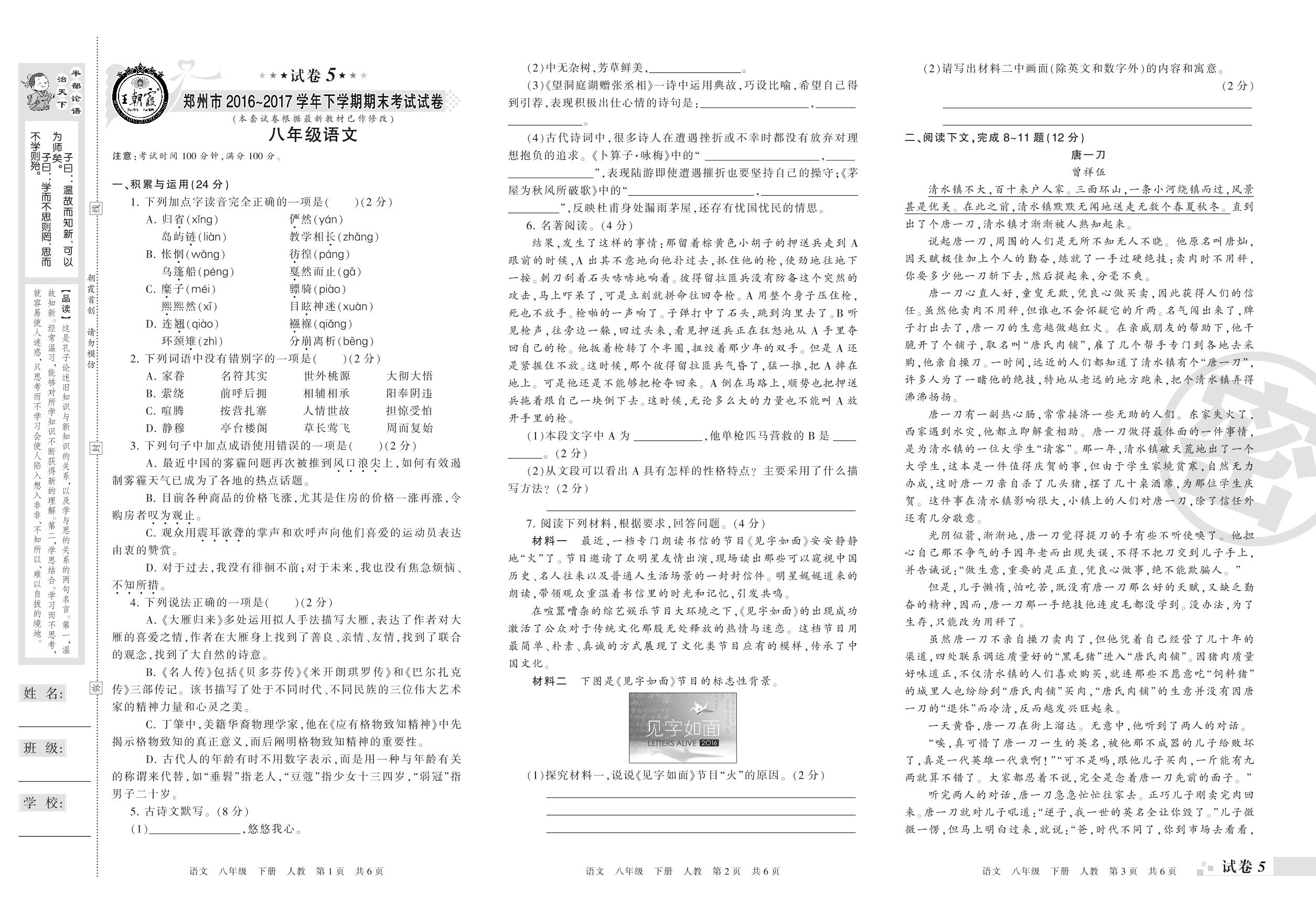 2016-2017学年第二学期郑州市八年级语文试卷(人教版)_R210802185050【5】