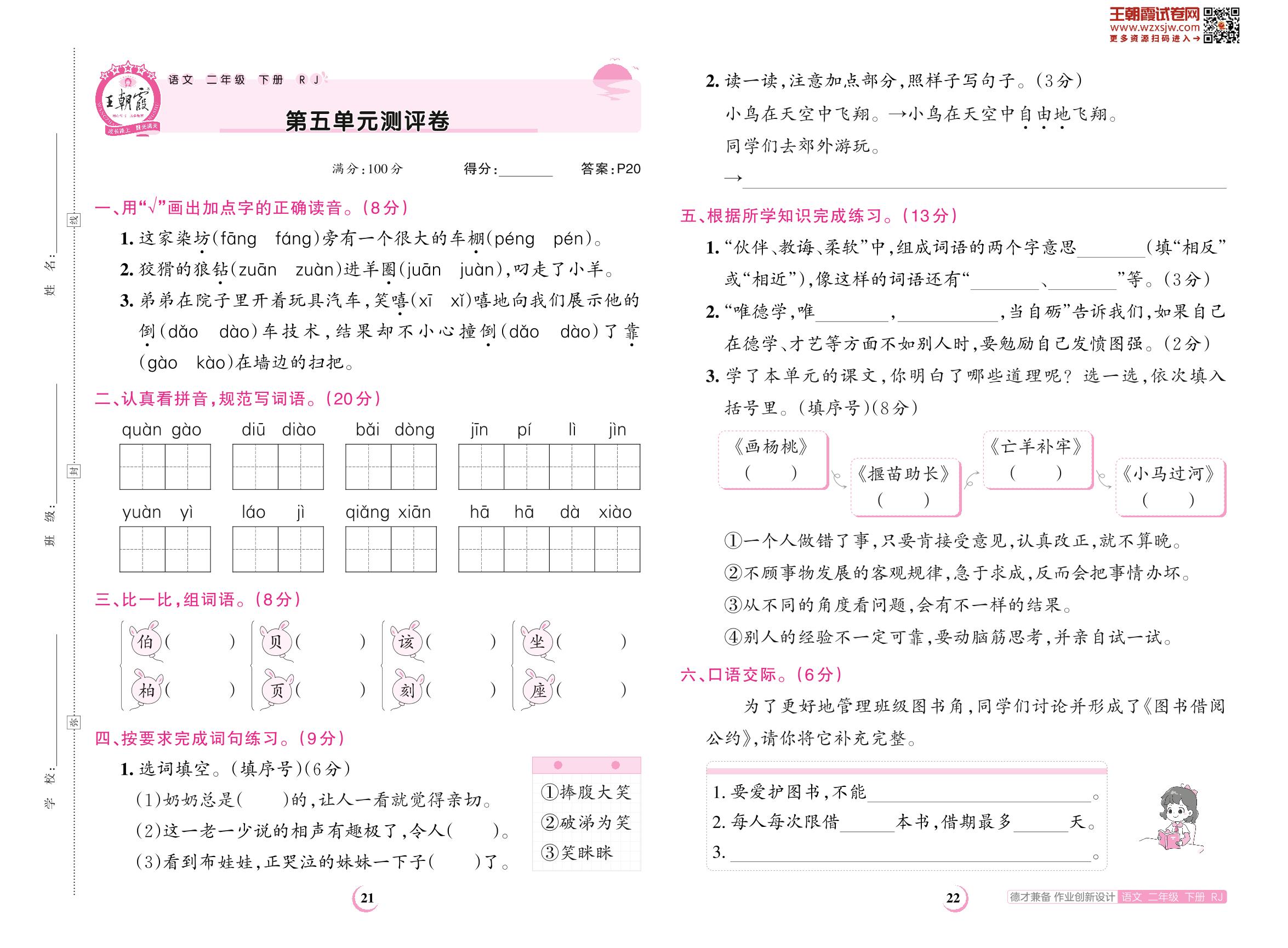 2023下册二年级语文人教版 第五单元测评卷