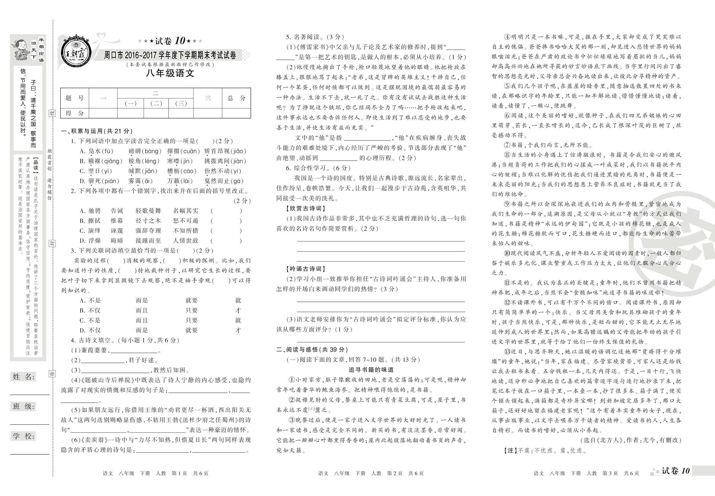 2016-2017学年第二学期周口市八年级语文试卷(人教版)【10】