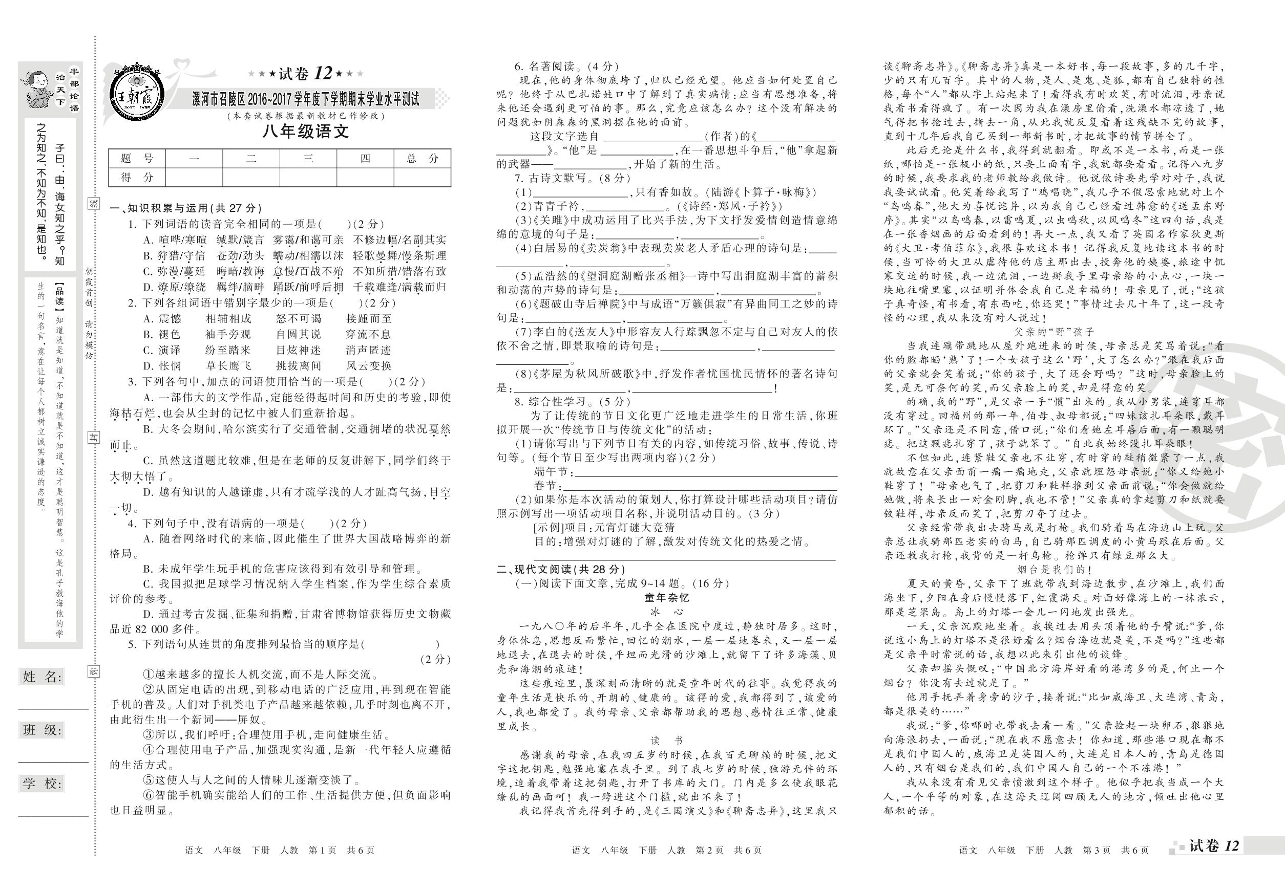 2016-2017学年第二学期漯河市召陵区八年级语文试卷(人教版)【12】
