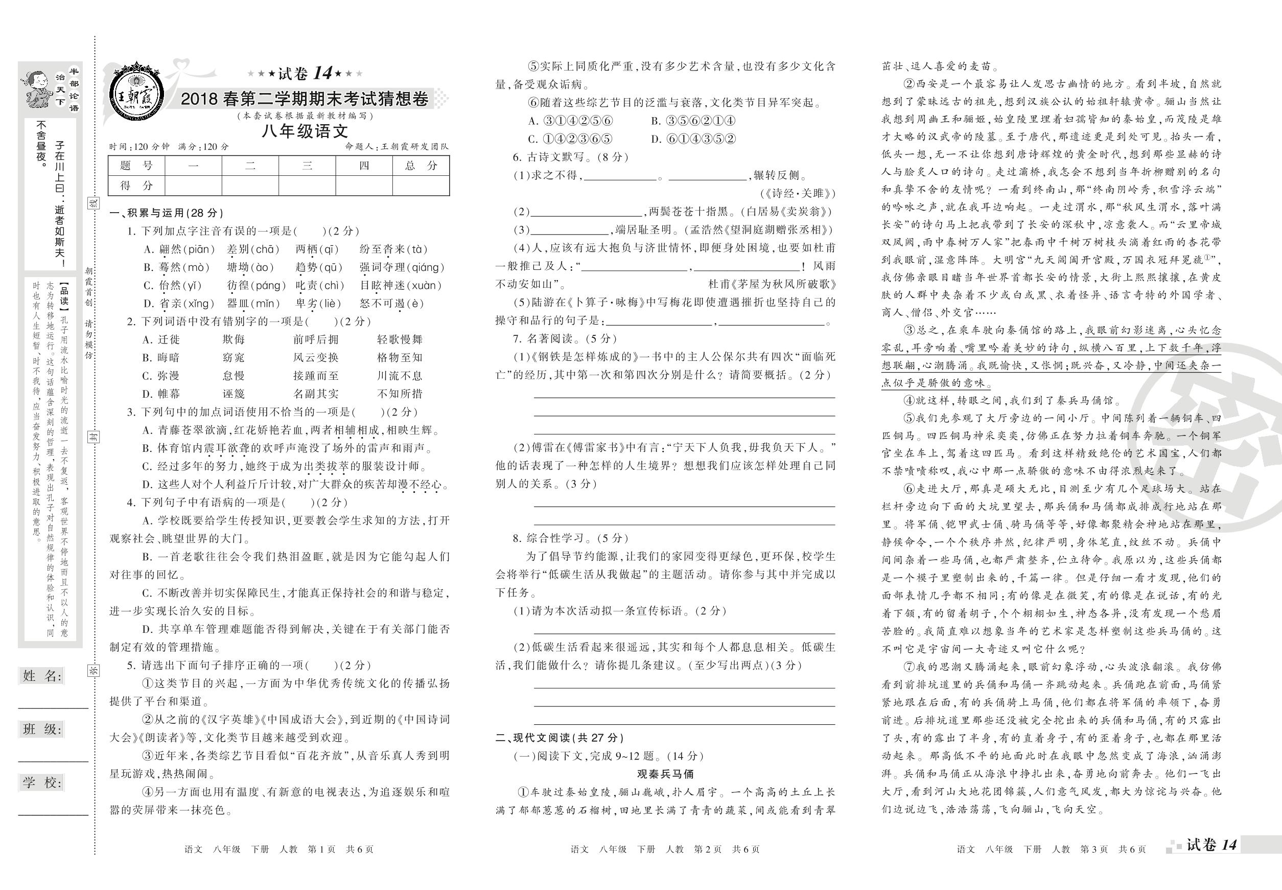 王朝霞期末猜想卷八年级下册语文(人教版)【14】
