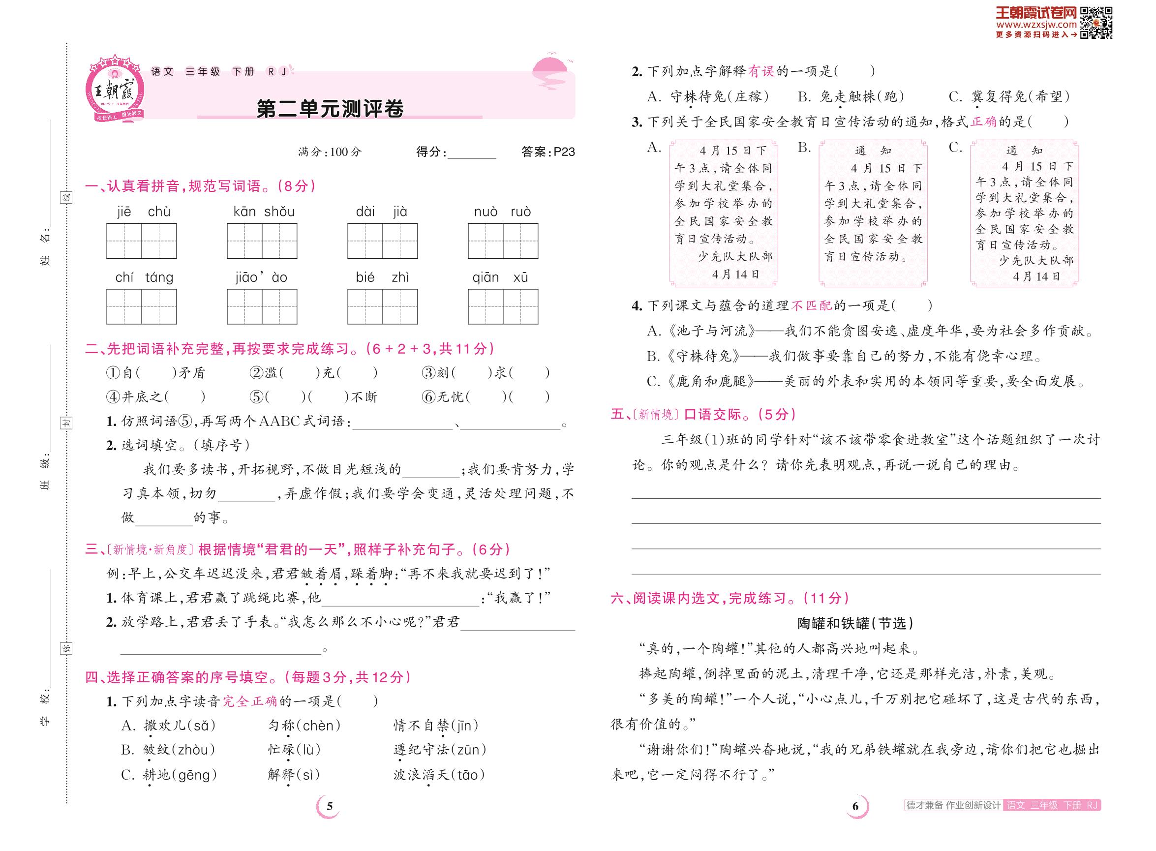 三年级语文人教版下册单元卷