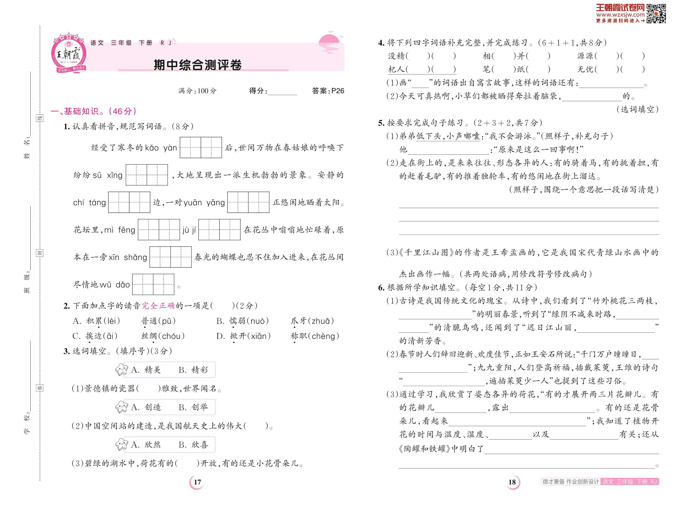 三年级语文人教版下册期中卷