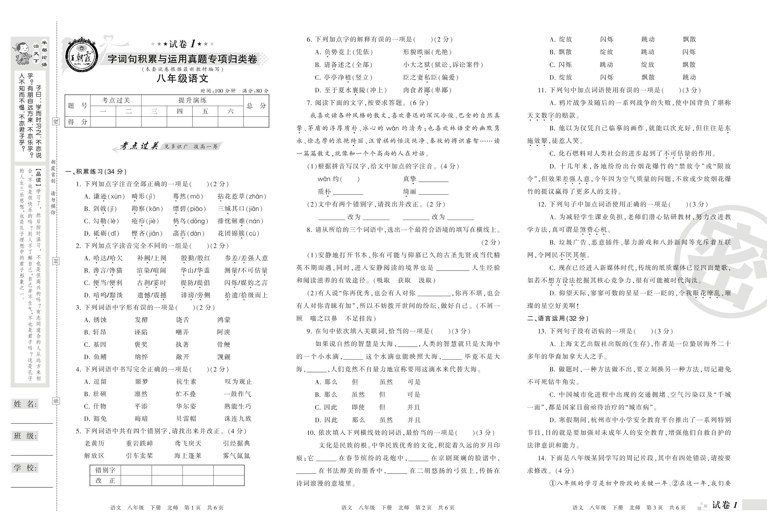 王朝霞期末专项卷——字词句积累与运用真题专项归类卷八年级下册语文(北师版)_R210802185457【1】