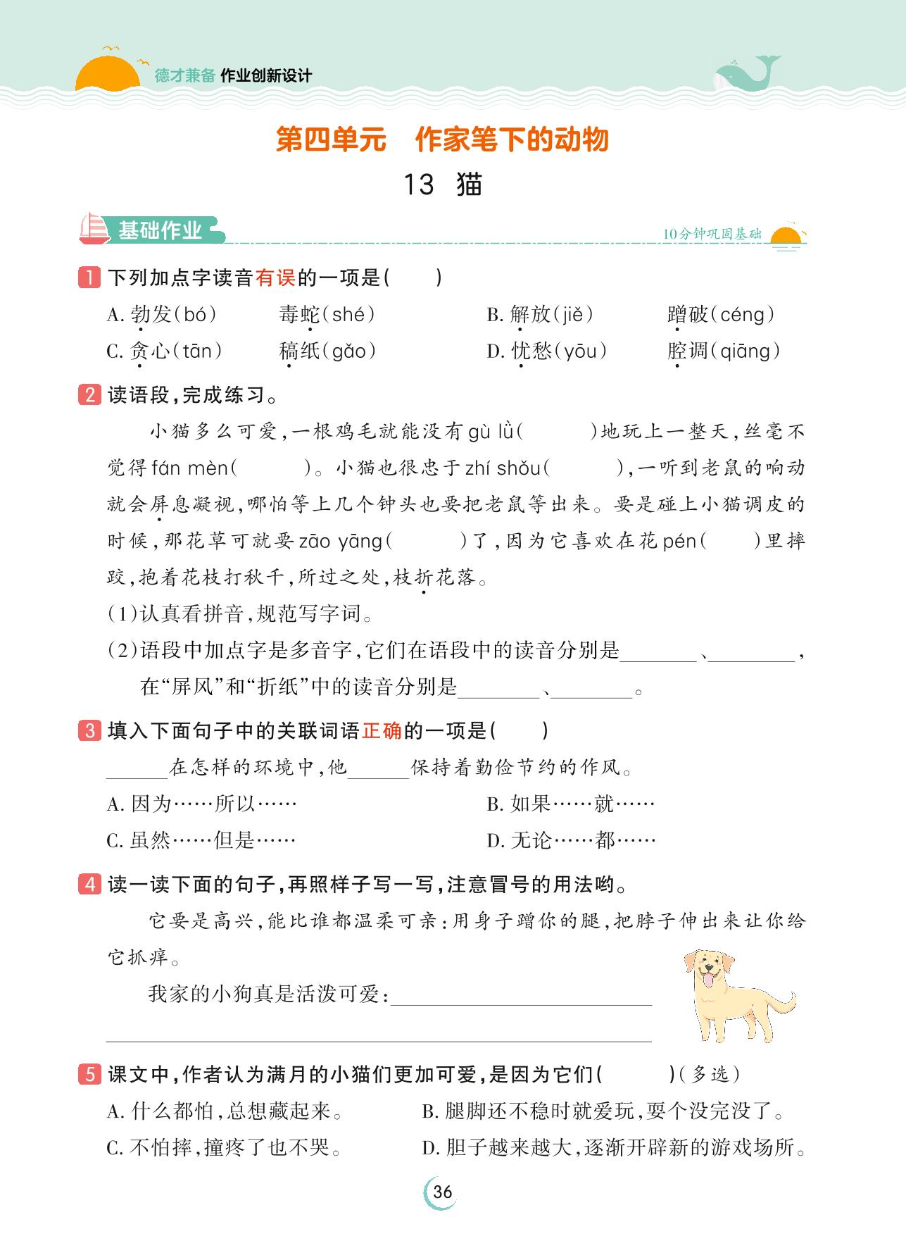 2023下册四年级语文人教版 第四单元 作家笔下的动物——13 猫