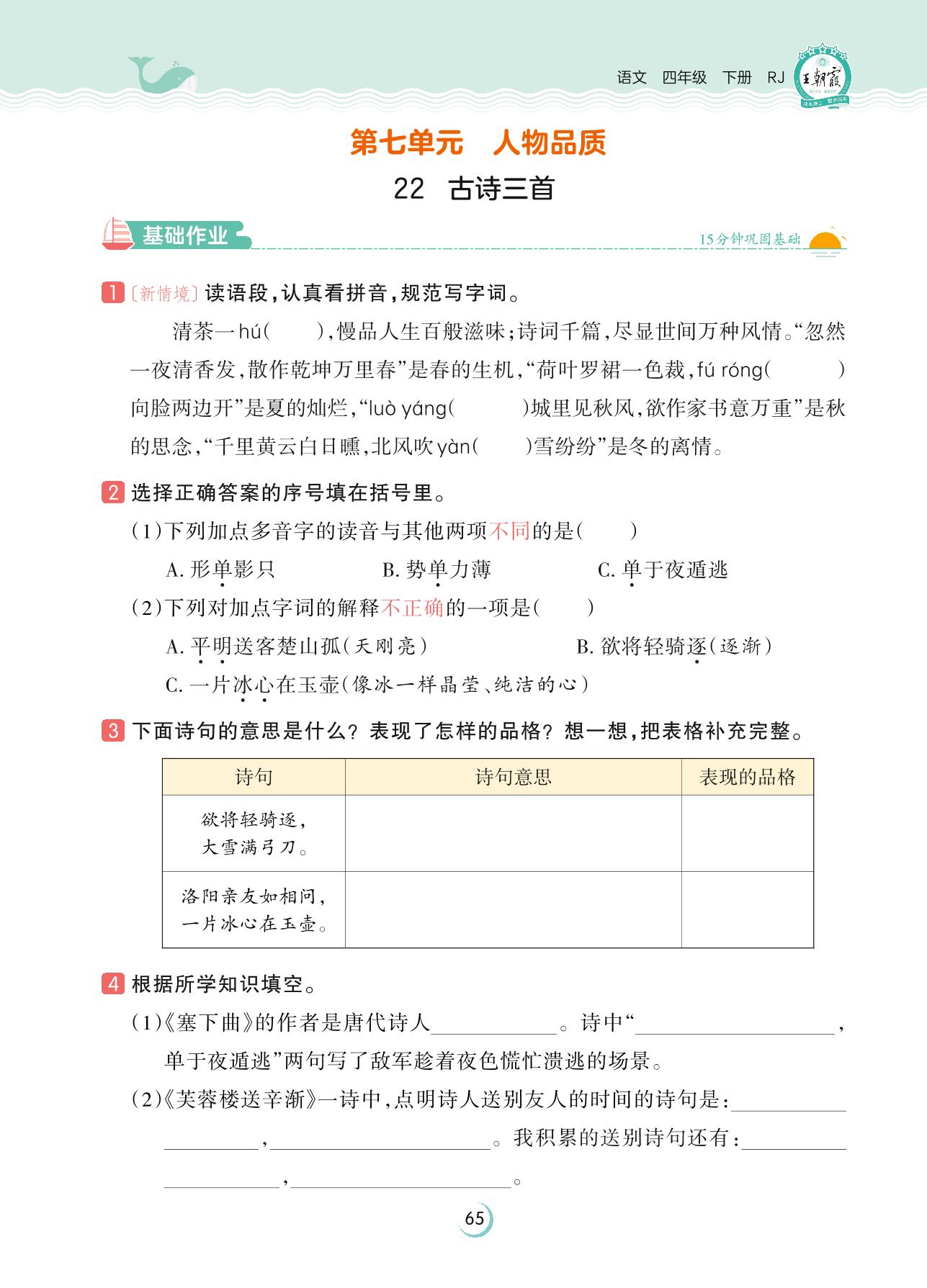 2023下册四年级语文人教版 第七单元 人物品质——22 古诗三首