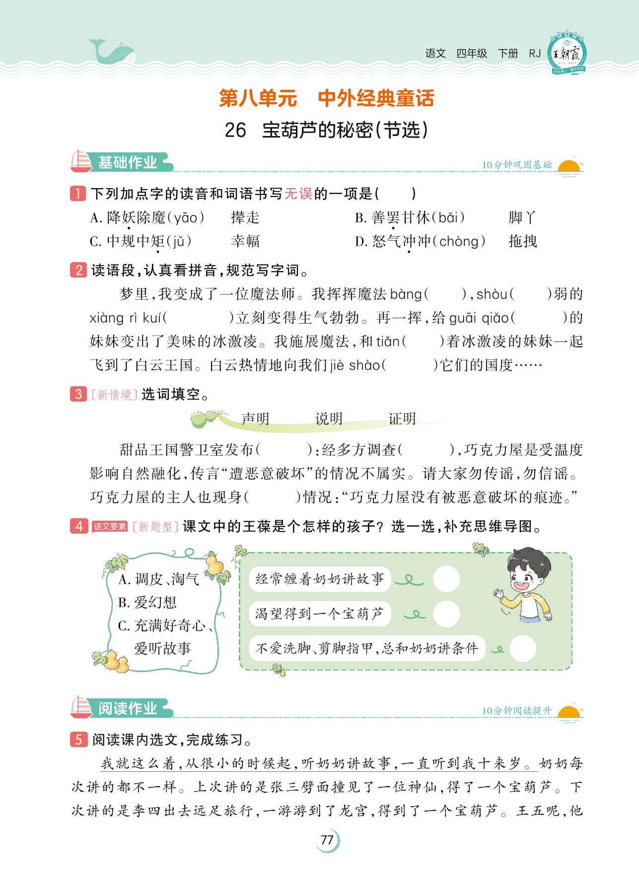 2023下册四年级语文人教版 第八单元 中外经典童话——26 宝葫芦的秘密(节选)