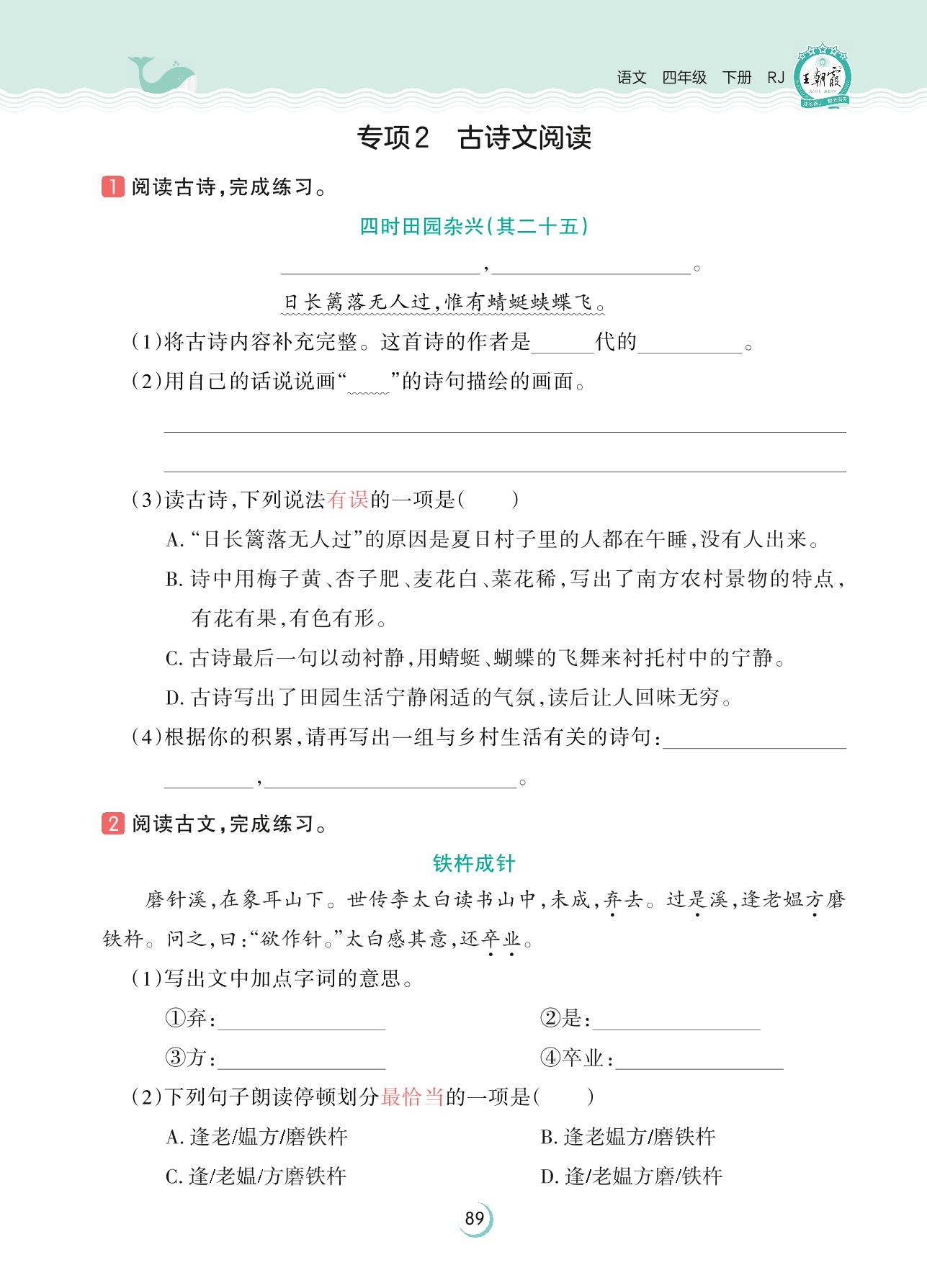 2023下册四年级语文人教版 新题新视野 专项训练——专项2 古诗文阅读