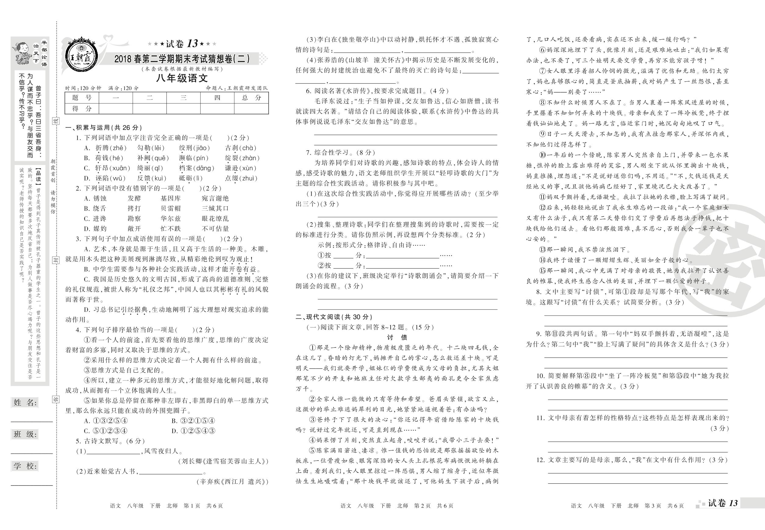 王朝霞期末猜想卷(二)八年级下册语文(北师版)【13】