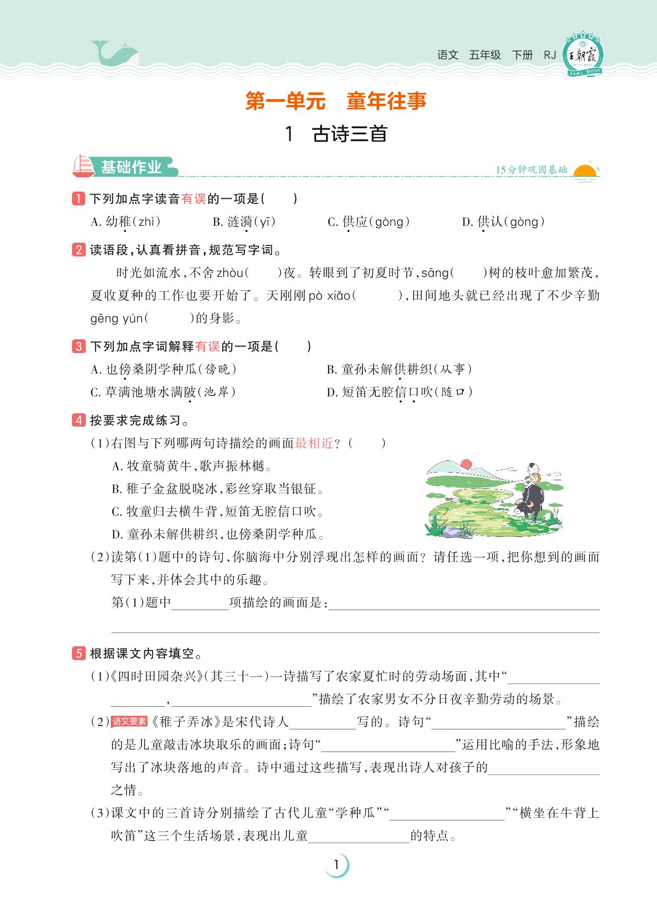 2023下册五年级语文人教版 第一单元 童年往事——1 古诗三首
