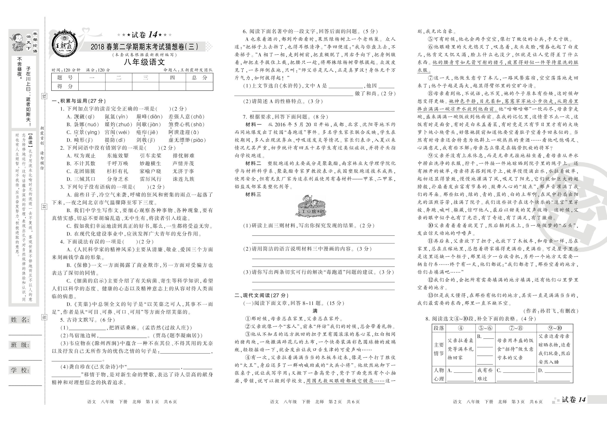 王朝霞期末猜想卷(三)八年级下册语文(北师版)【14】