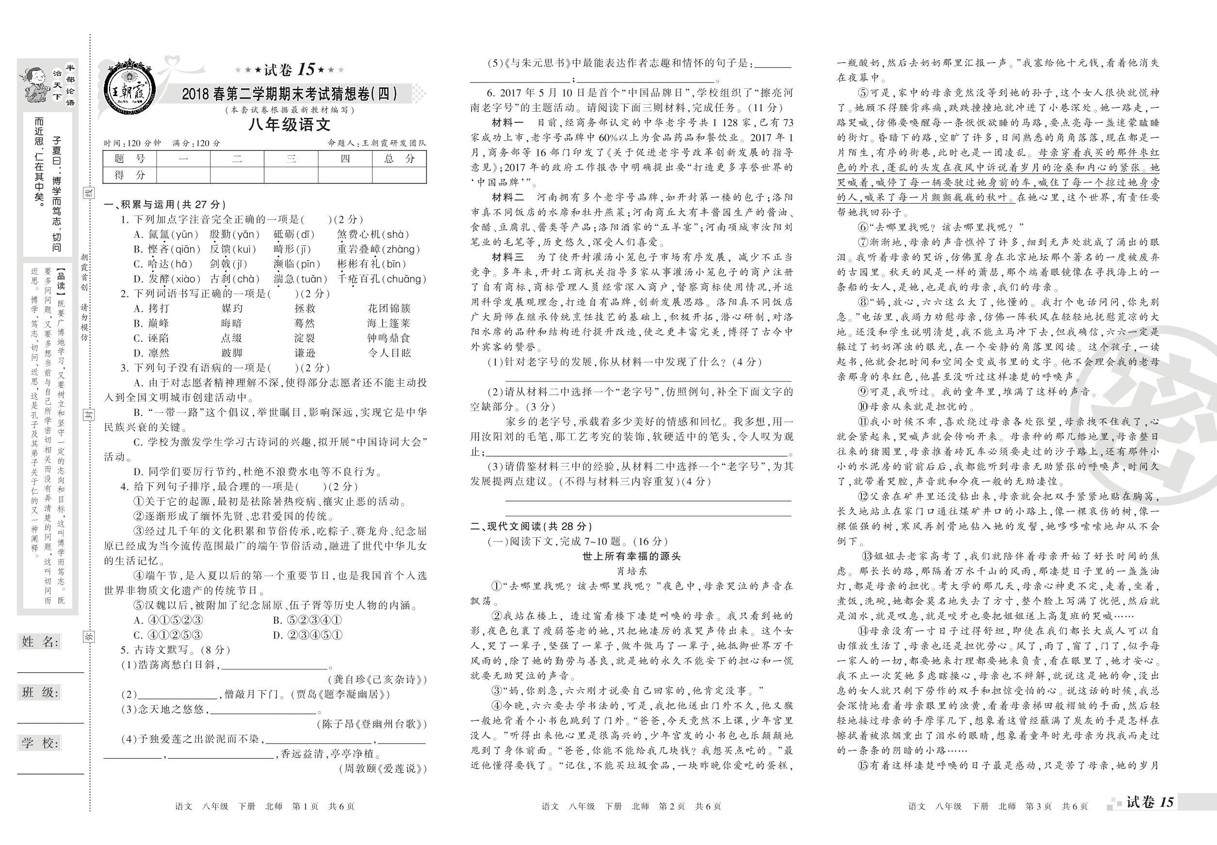 王朝霞期末猜想卷(四)八年级下册语文(北师版)【15】