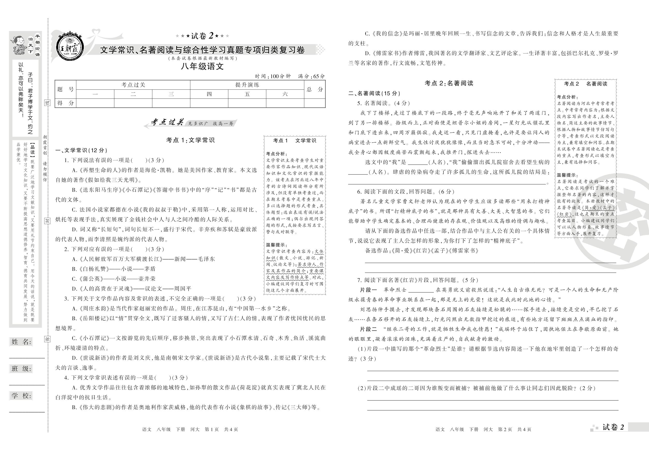 王朝霞期末专项卷——文学常识、名著阅读与综合性学习真题专项归类复习卷八年级下册语文(河大版)【2】
