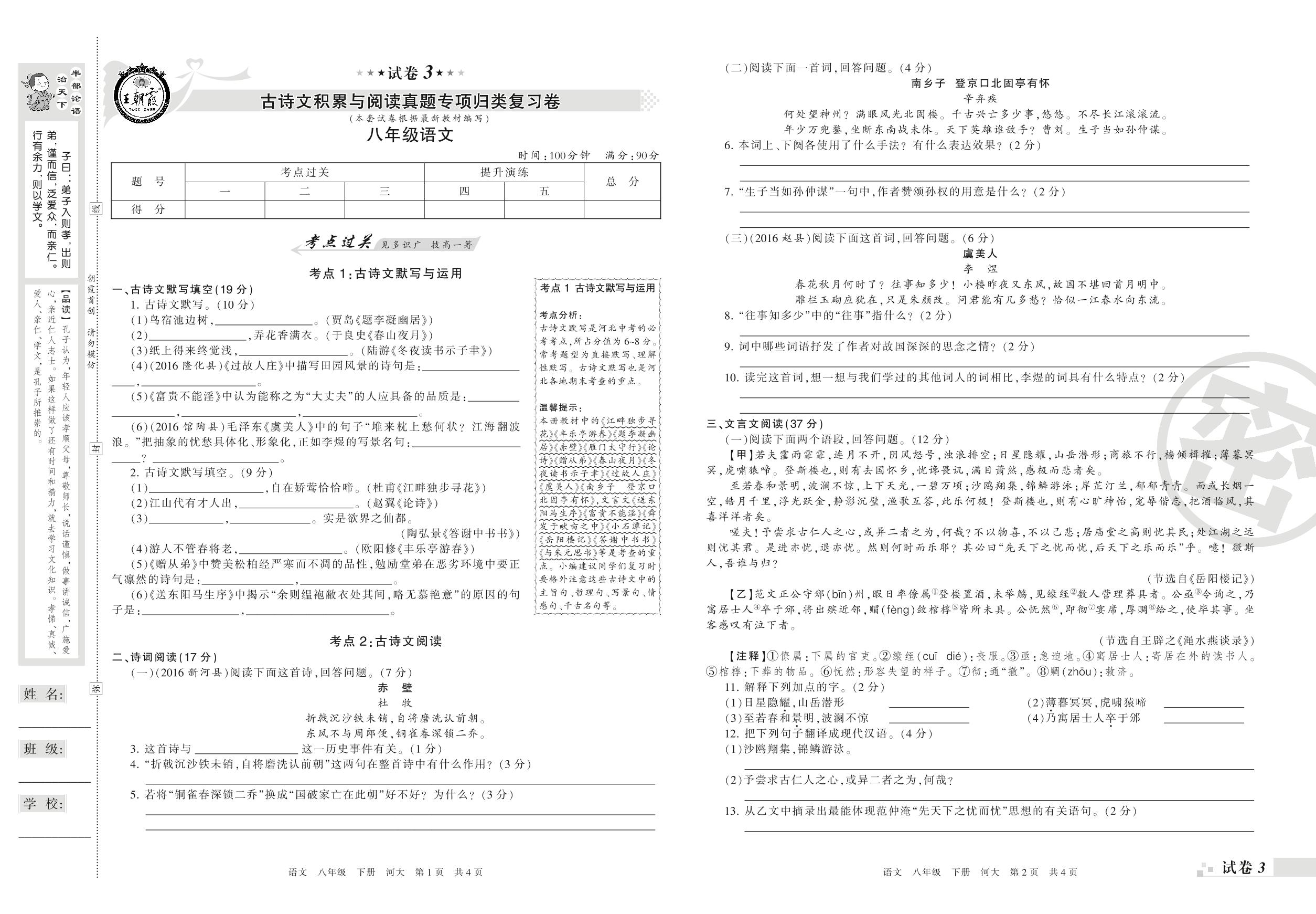 王朝霞期末专项卷——古诗文积累与阅读真题专项归类复习卷八年级下册语文(河大版)【3】