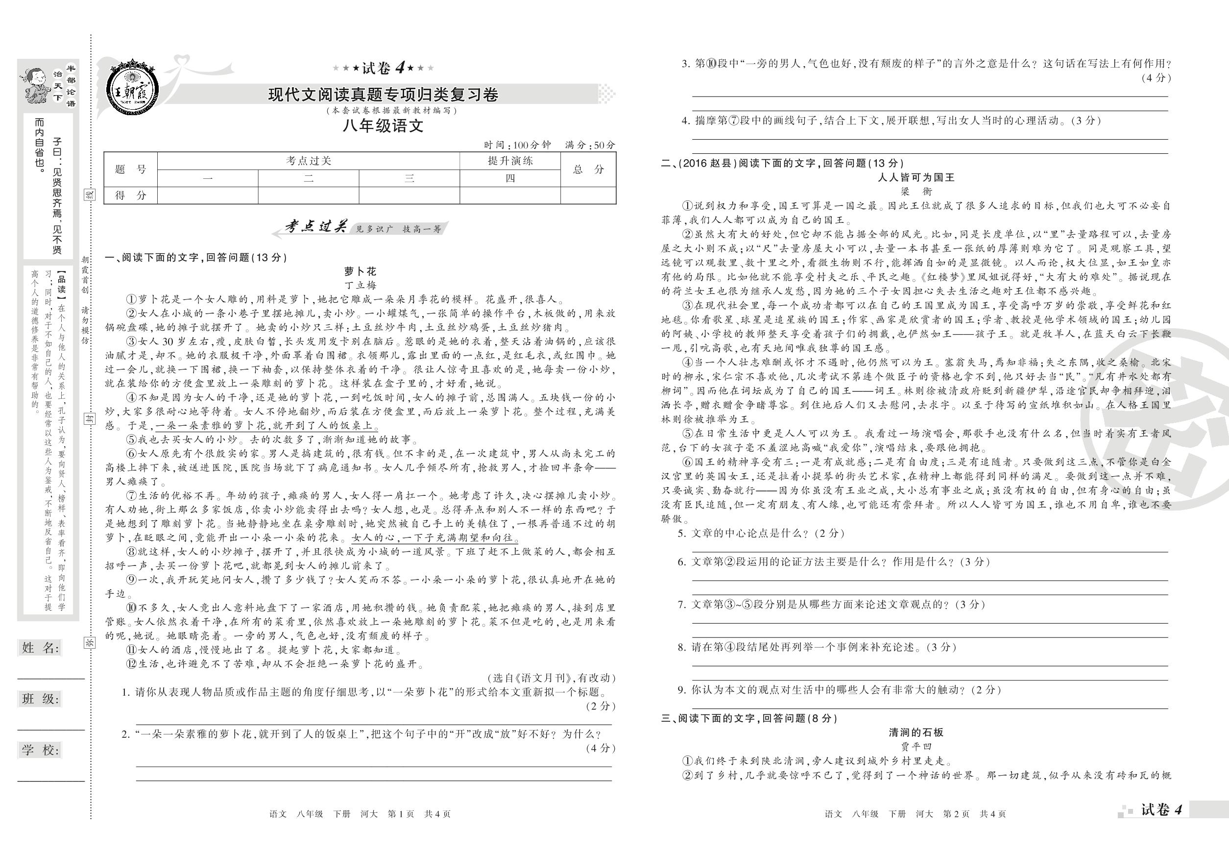 王朝霞期末专项卷——现代文阅读真题专项归类复习卷八年级下册语文(河大版)【4】
