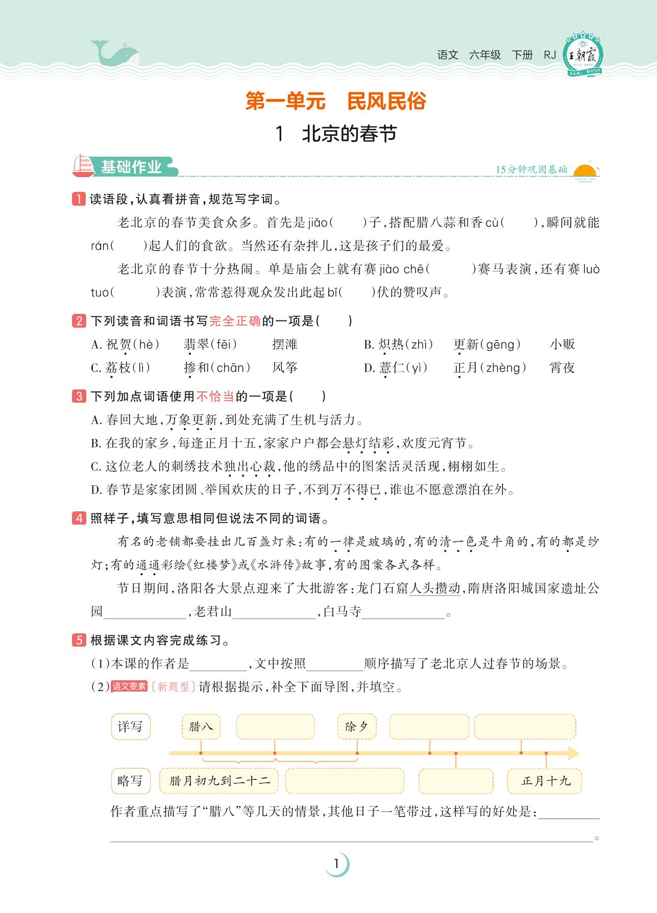 2023下册六年级语文人教版 第一单元 民风民俗——1 北京的春节