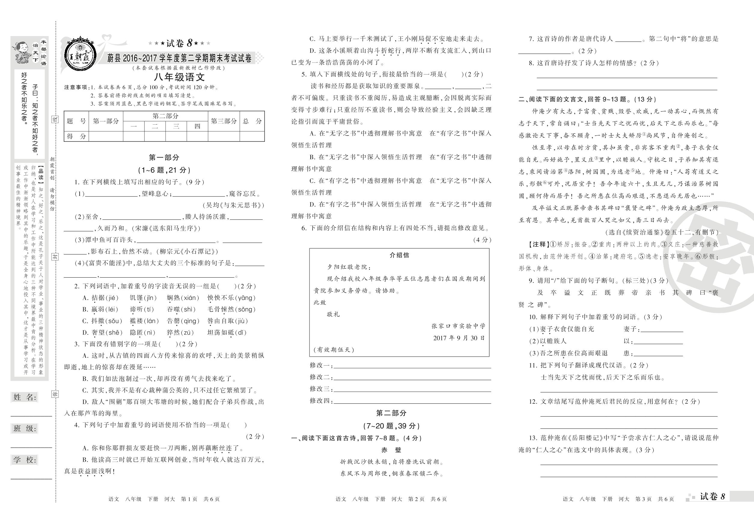 2016-2017学年第二学期张家口市蔚县八年级语文试卷(河大版)【8】