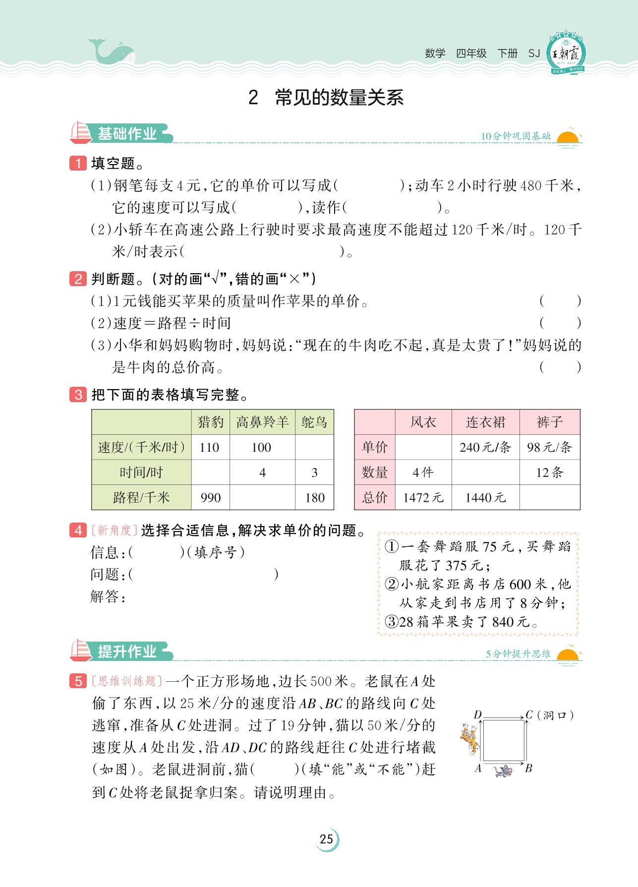 2023下册四年级数学苏教版 第三单元 三位数乘两位数——2 常见的数量关系