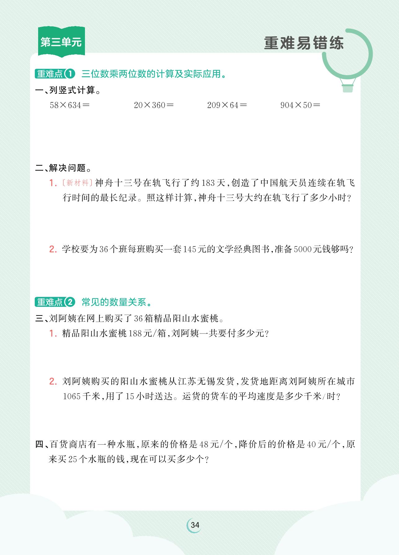 2023下册四年级数学苏教版 第三单元重难易错练