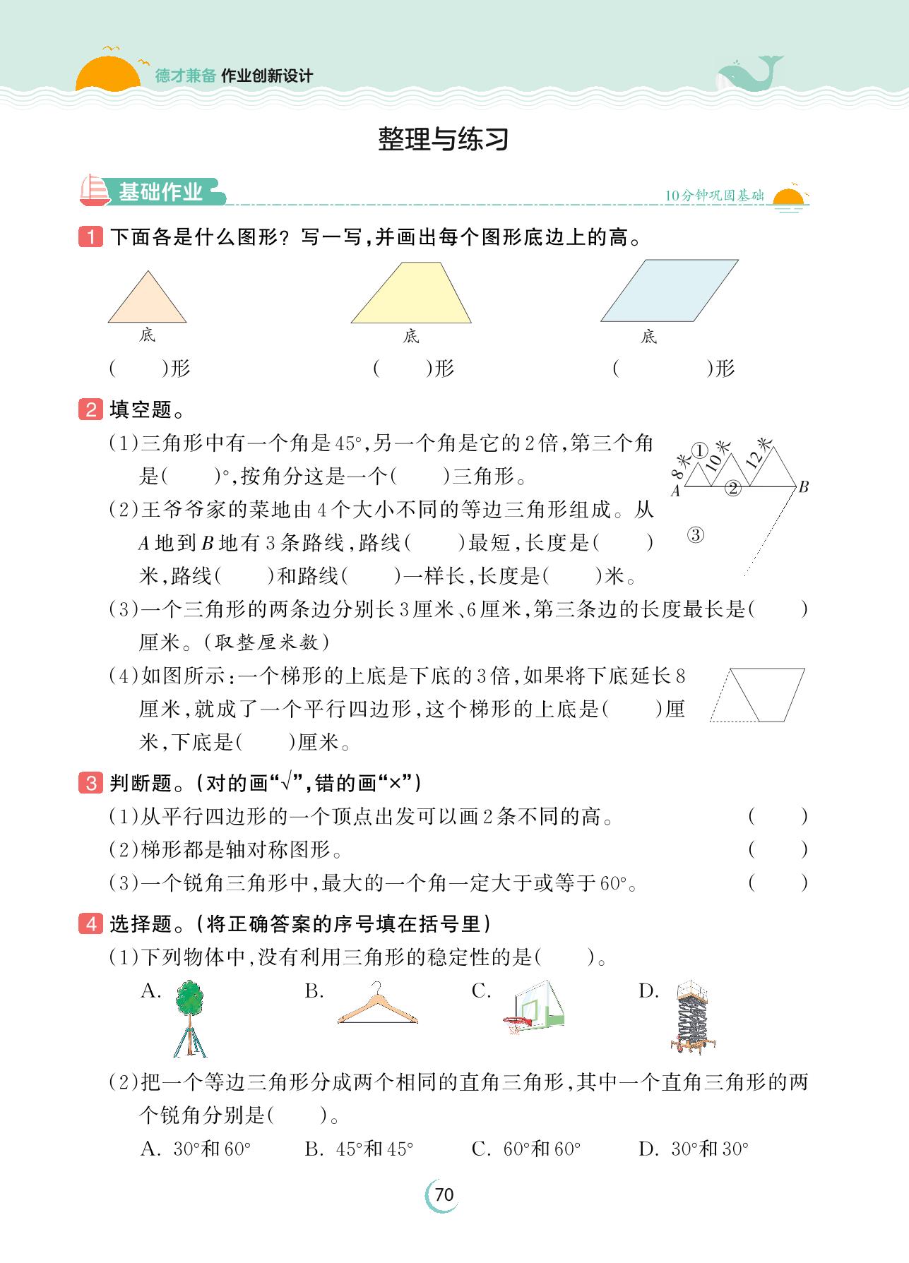 2023下册四年级数学苏教版 第七单元 三角形、平行四边形和梯形——整理与练习