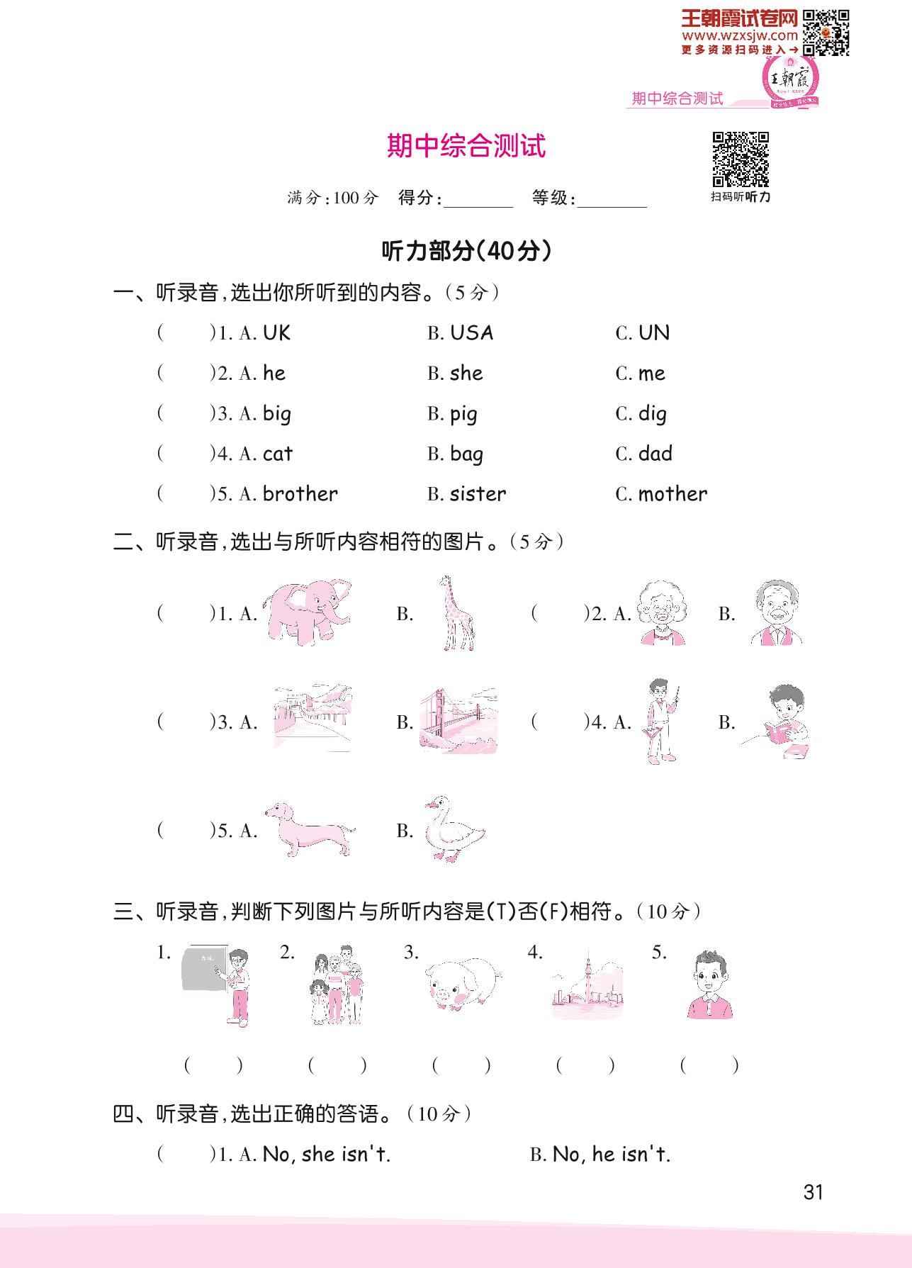 三年级英语人教PEP版(三起始)下册期中卷