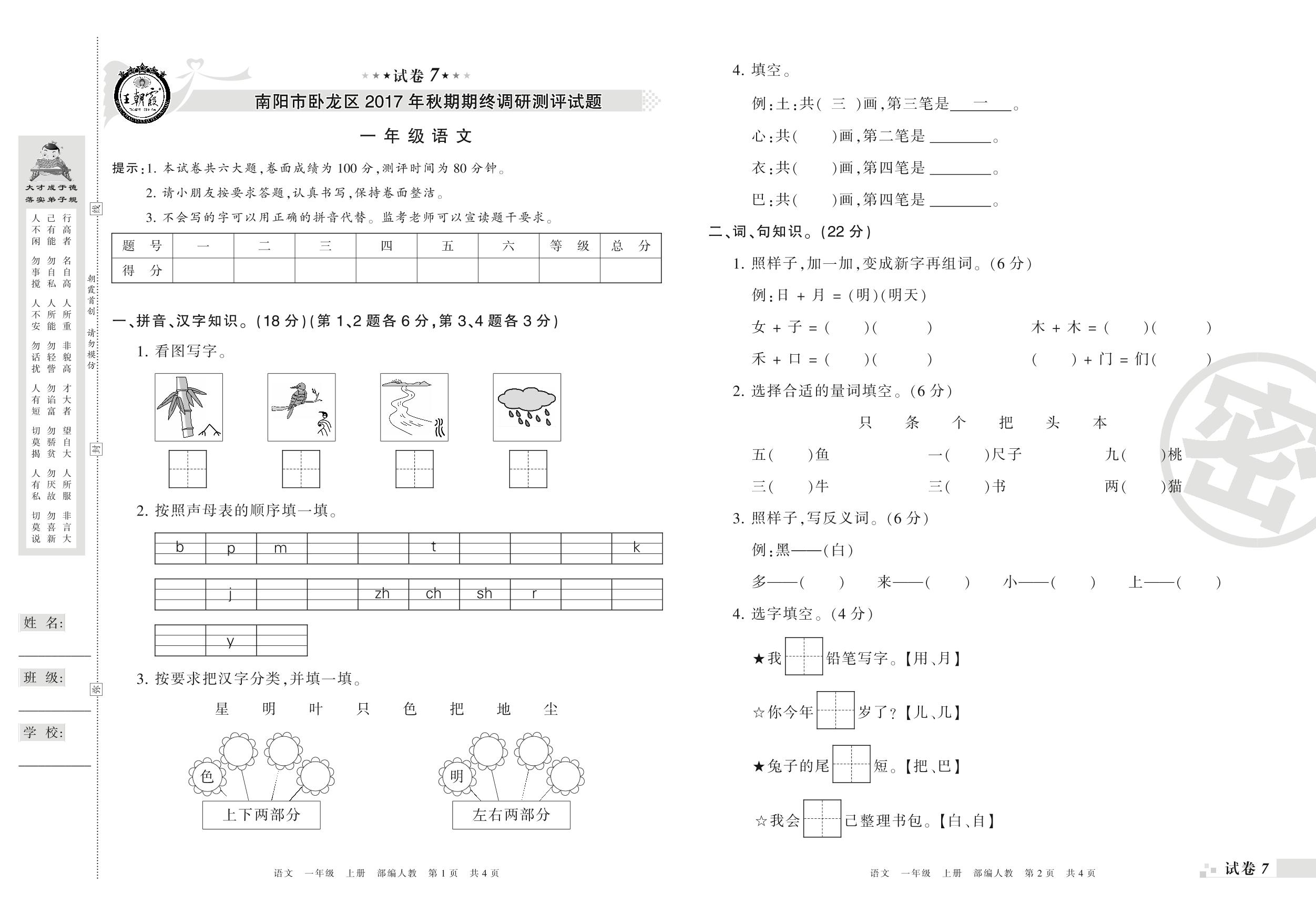 2017-2018学年第一学期南阳市卧龙区一年级语文试卷(人教版)【7】
