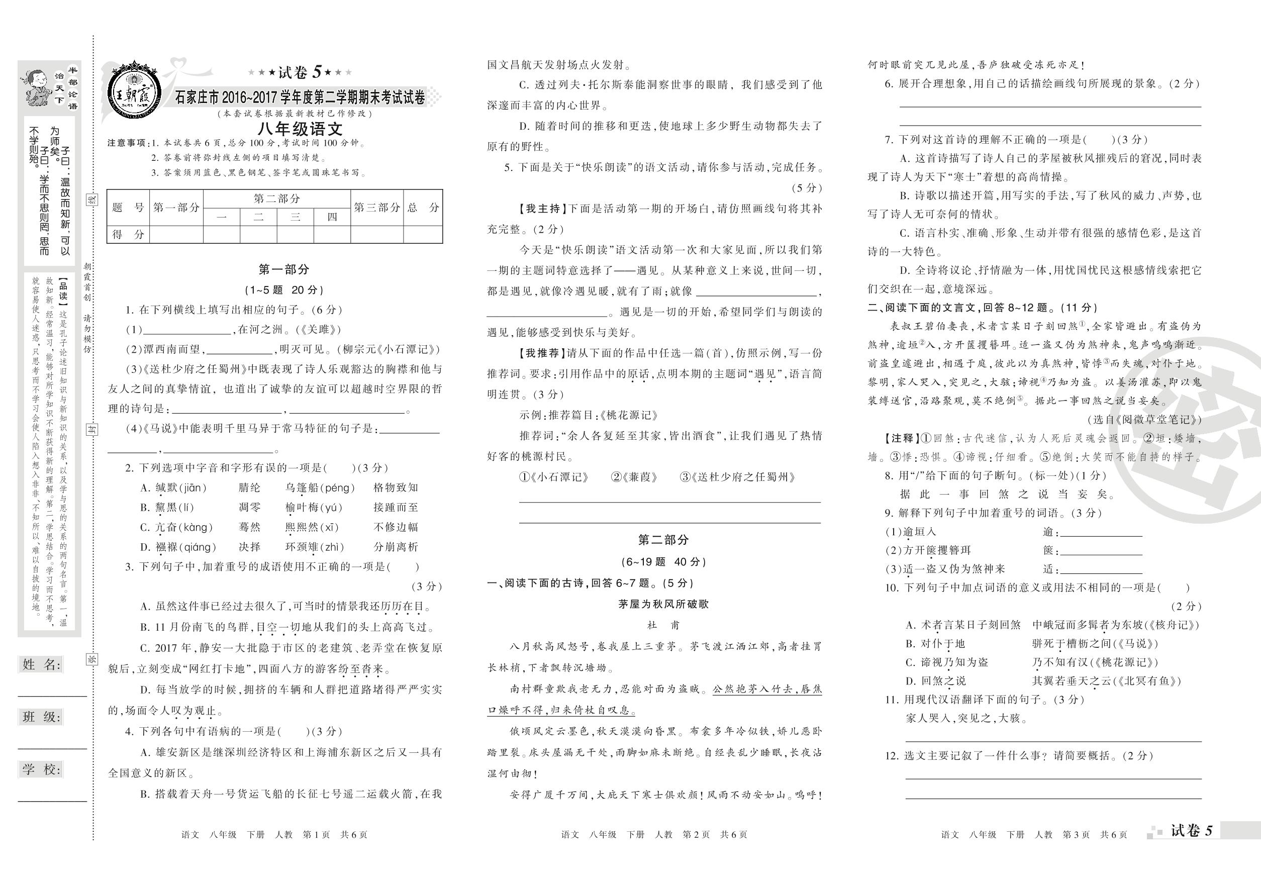 2016-2017学年第二学期石家庄市八年级语文试卷(人教版)【5】