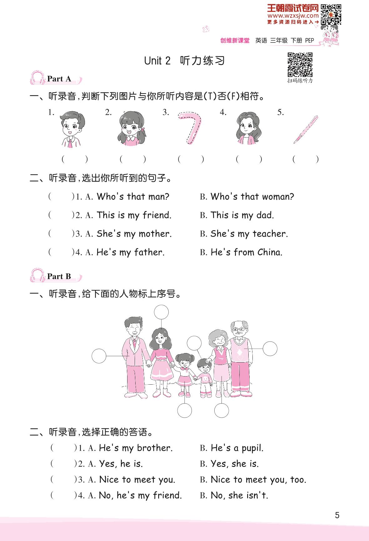2023下册三年级英语人教PEP版 Unit 2 My family—Part A、Part B 听力练习