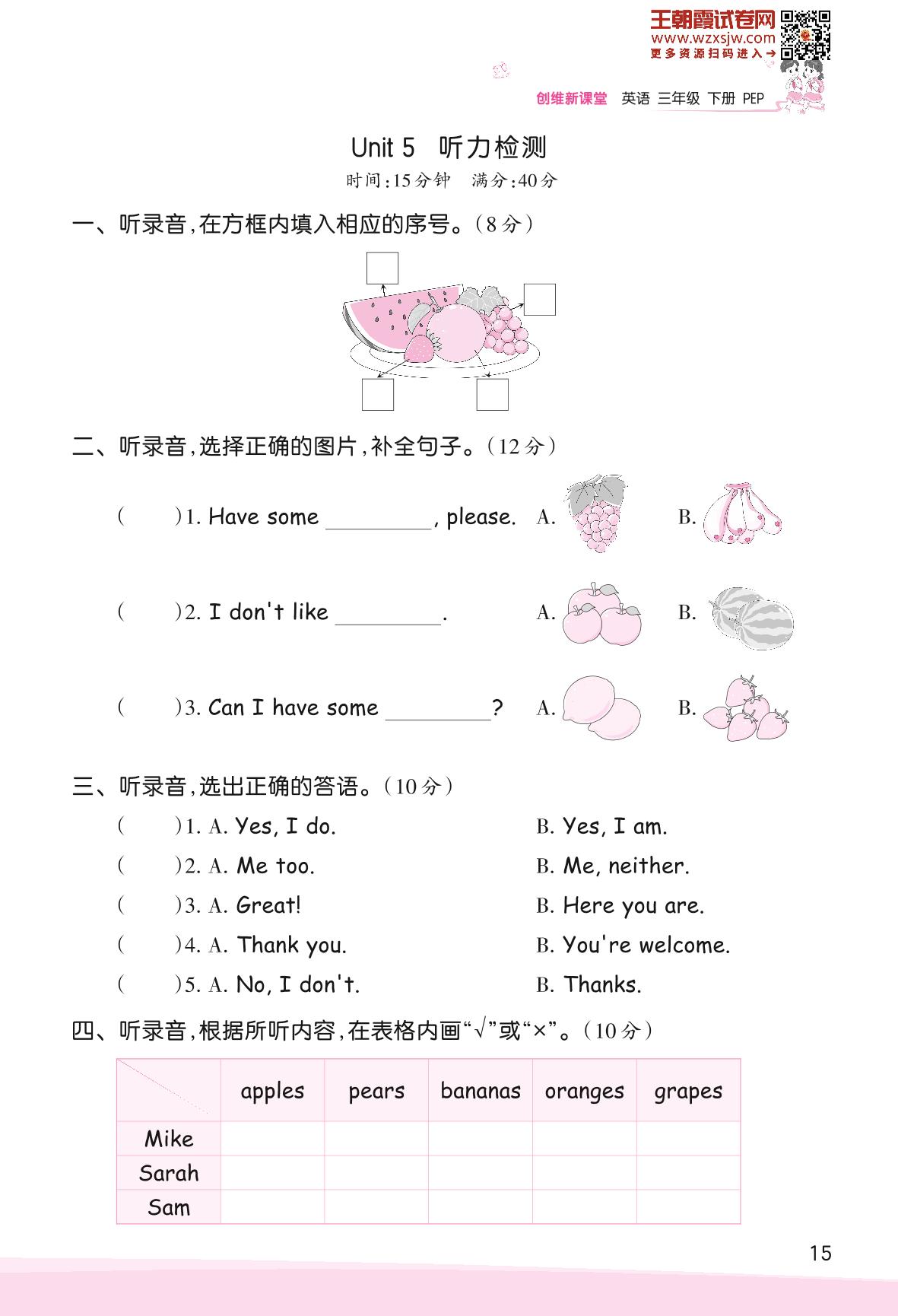 2023下册三年级英语人教PEP版 Unit 5 Do you like pears?—听力检测