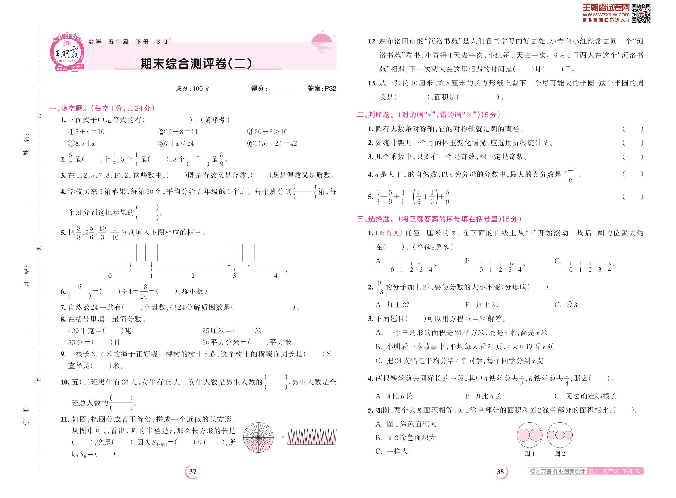 2023下册五年级数学苏教版 期末综合测评卷(二)