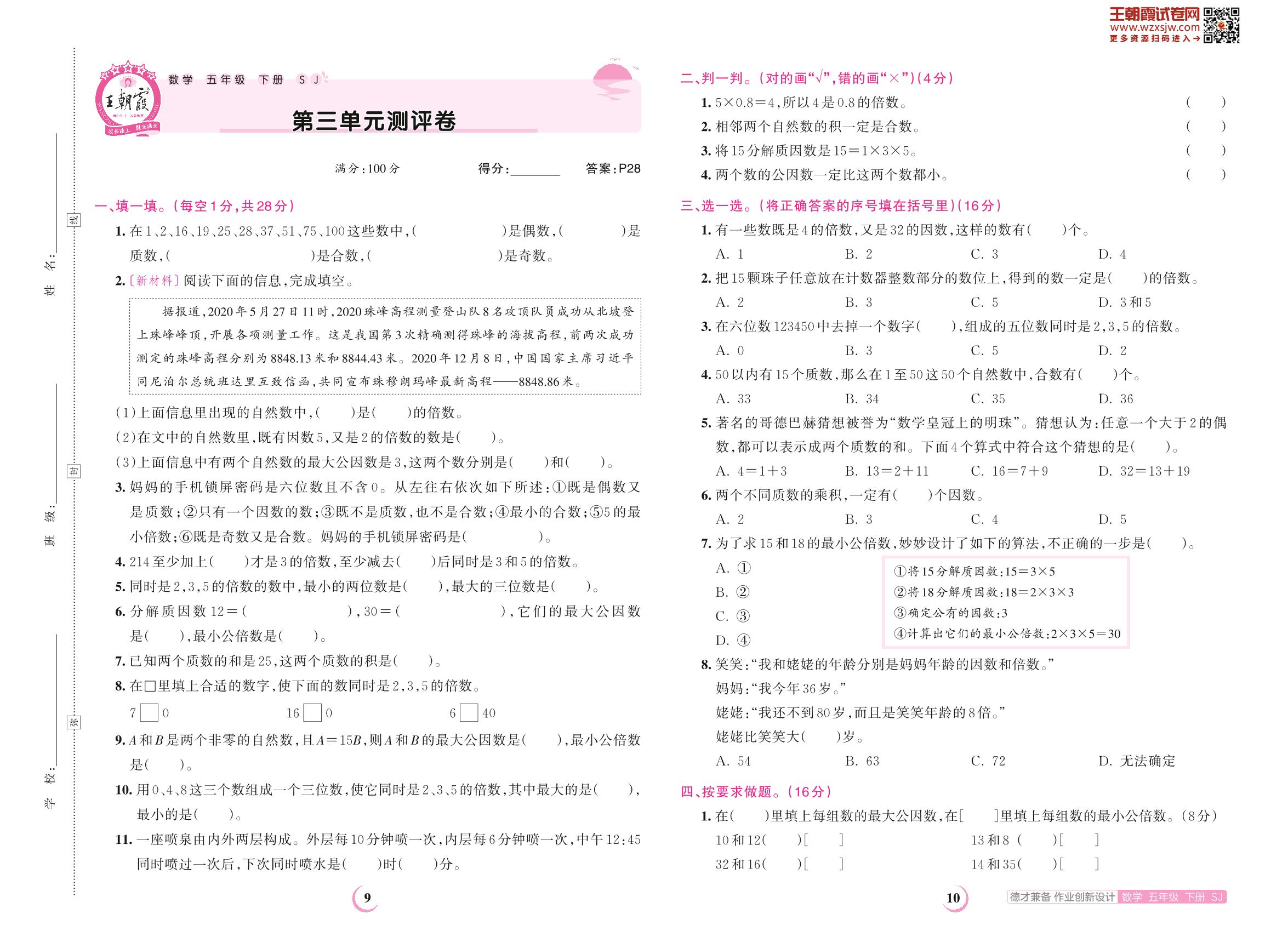 五年级数学苏教版下册单元卷