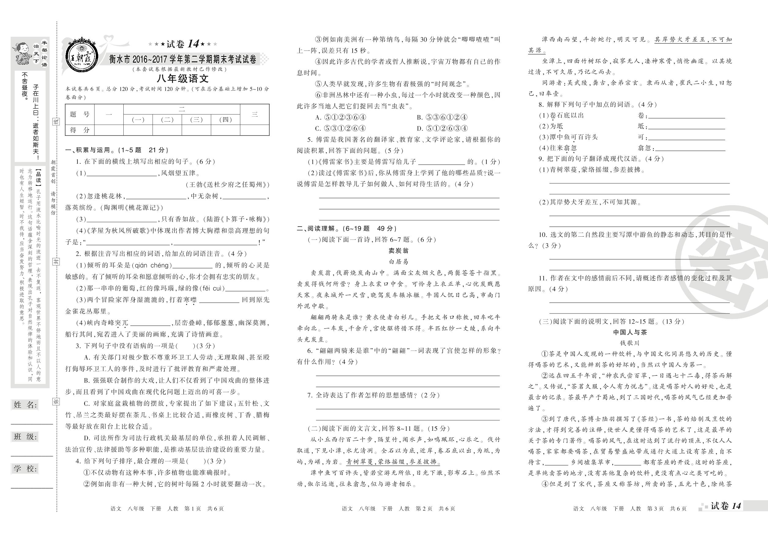2016-2017学年第二学期衡水市八年级语文试卷(人教版)【14】