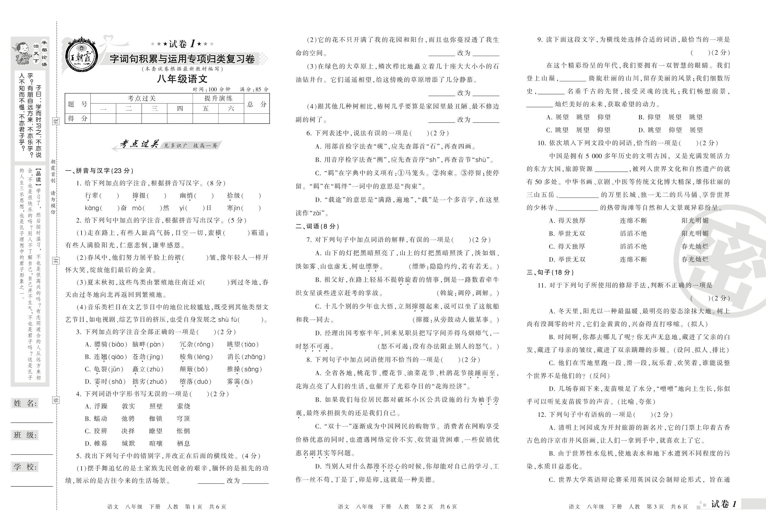 王朝霞期末专项卷——字词句积累与运用专项归类复习卷八年级下册语文(人教版)_R210802190708【1】