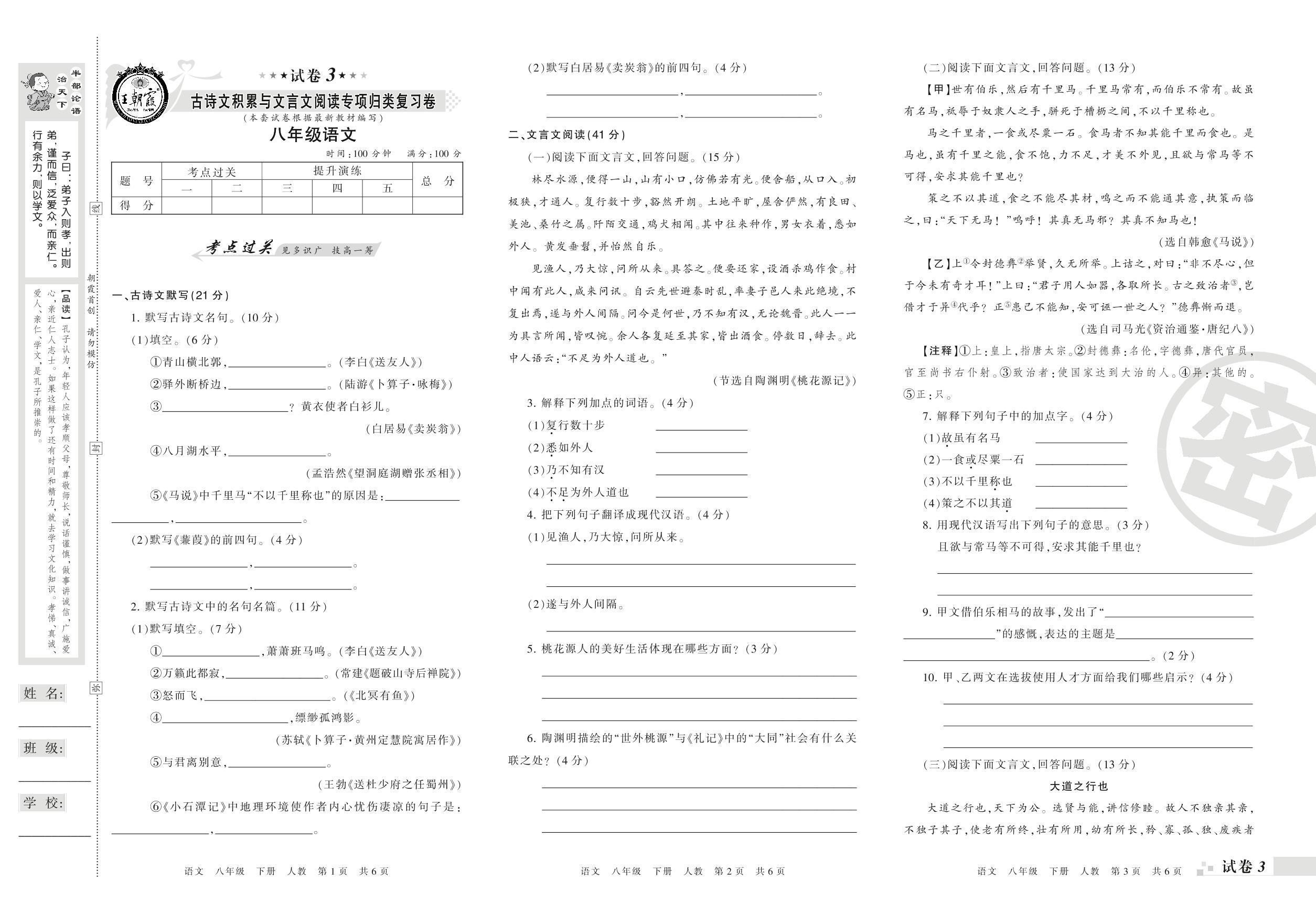王朝霞期末专项卷——古诗文积累与文言文阅读专项归类复习卷八年级下册语文(人教版)_R210802190738【3】