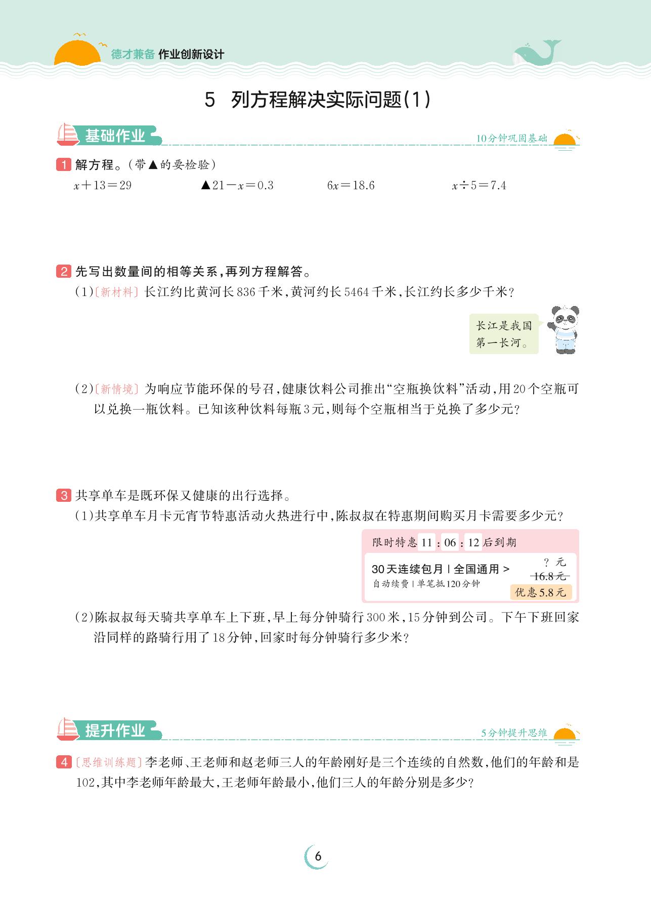 2023下册五年级数学苏教版 第一单元 简易方程——5 列方程解决实际问题(1)