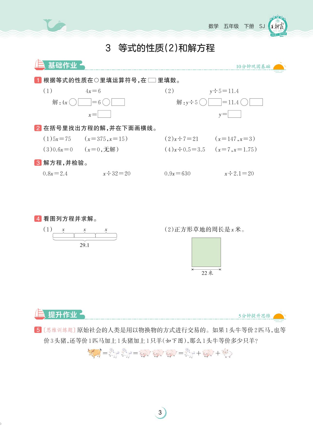 2023下册五年级数学苏教版 第一单元 简易方程——3 等式的性质(2)和解方程