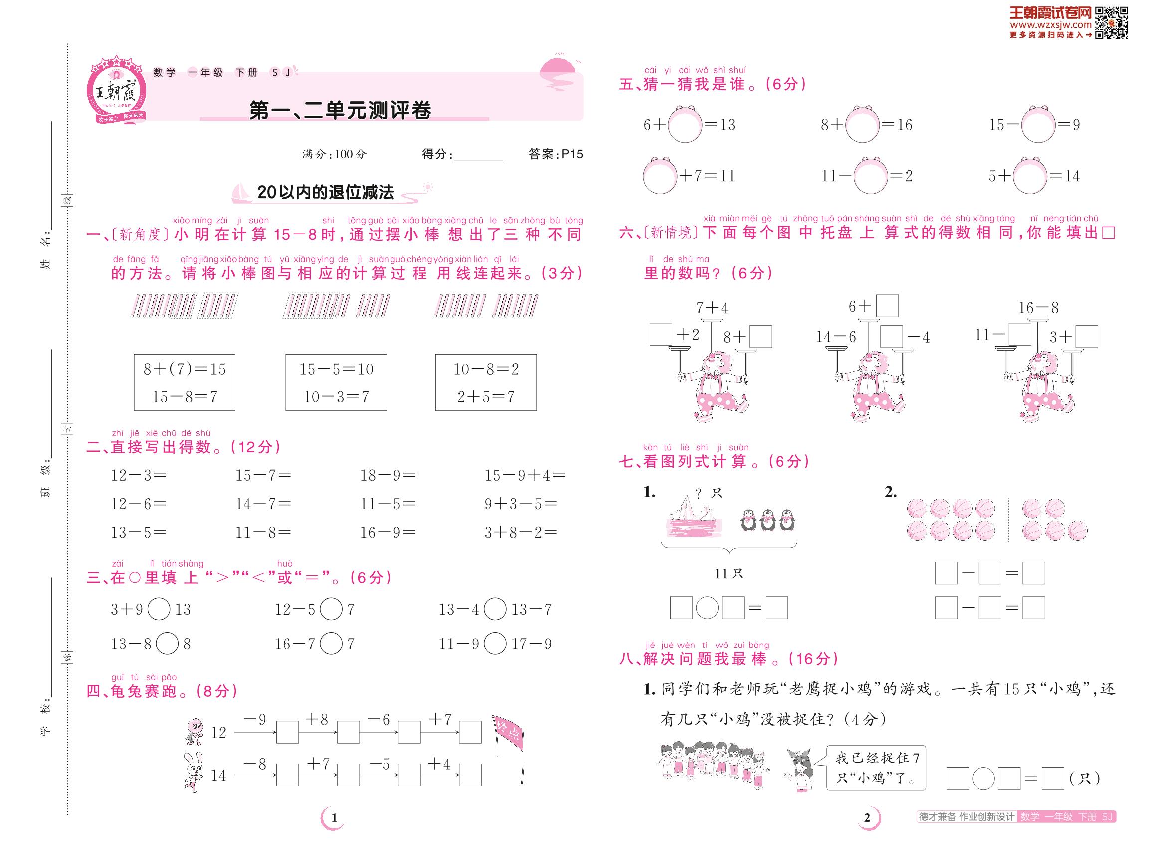 2023下册一年级数学苏教版 第一、二单元测评卷