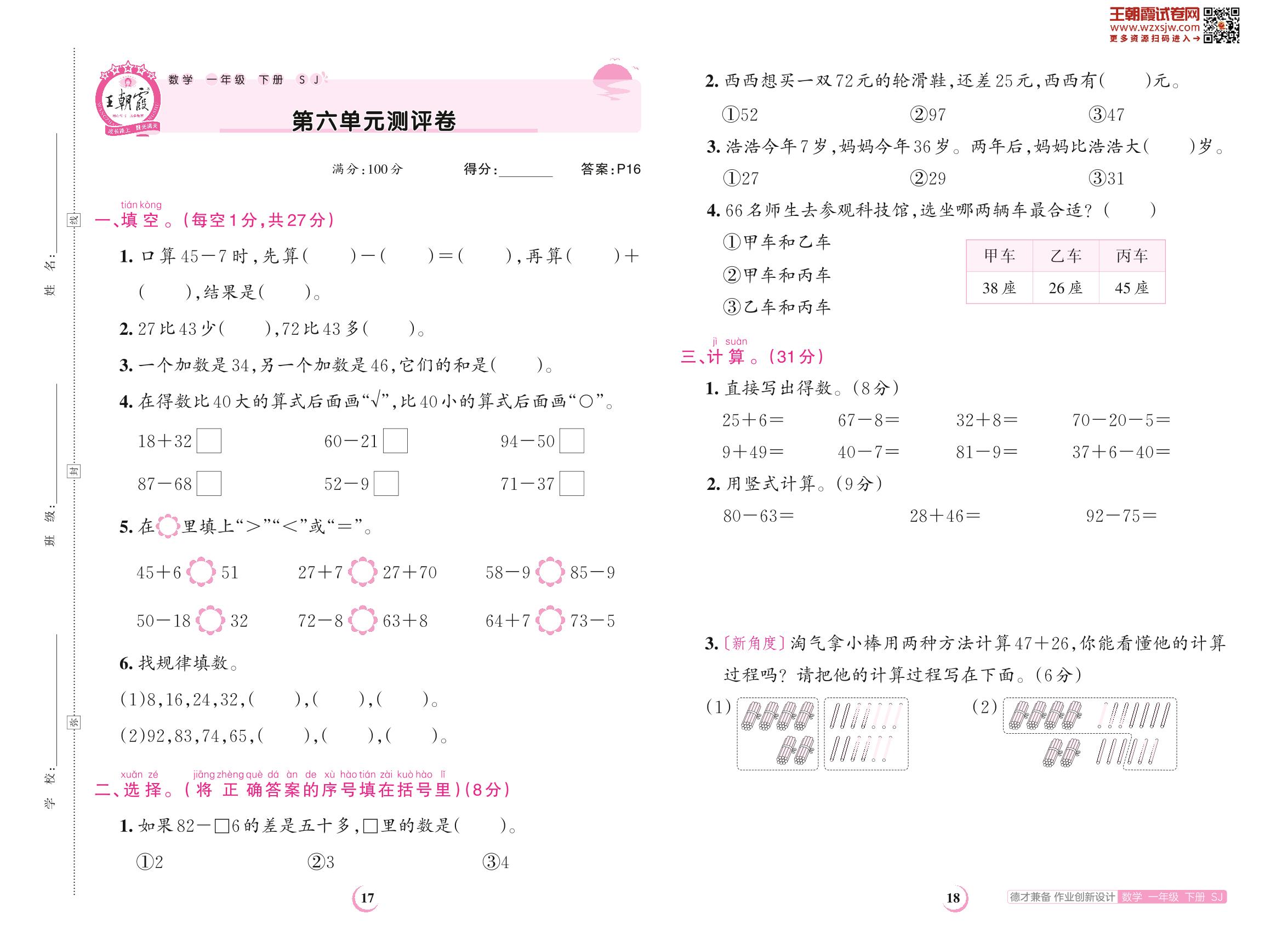 一年级数学苏教版下册单元卷