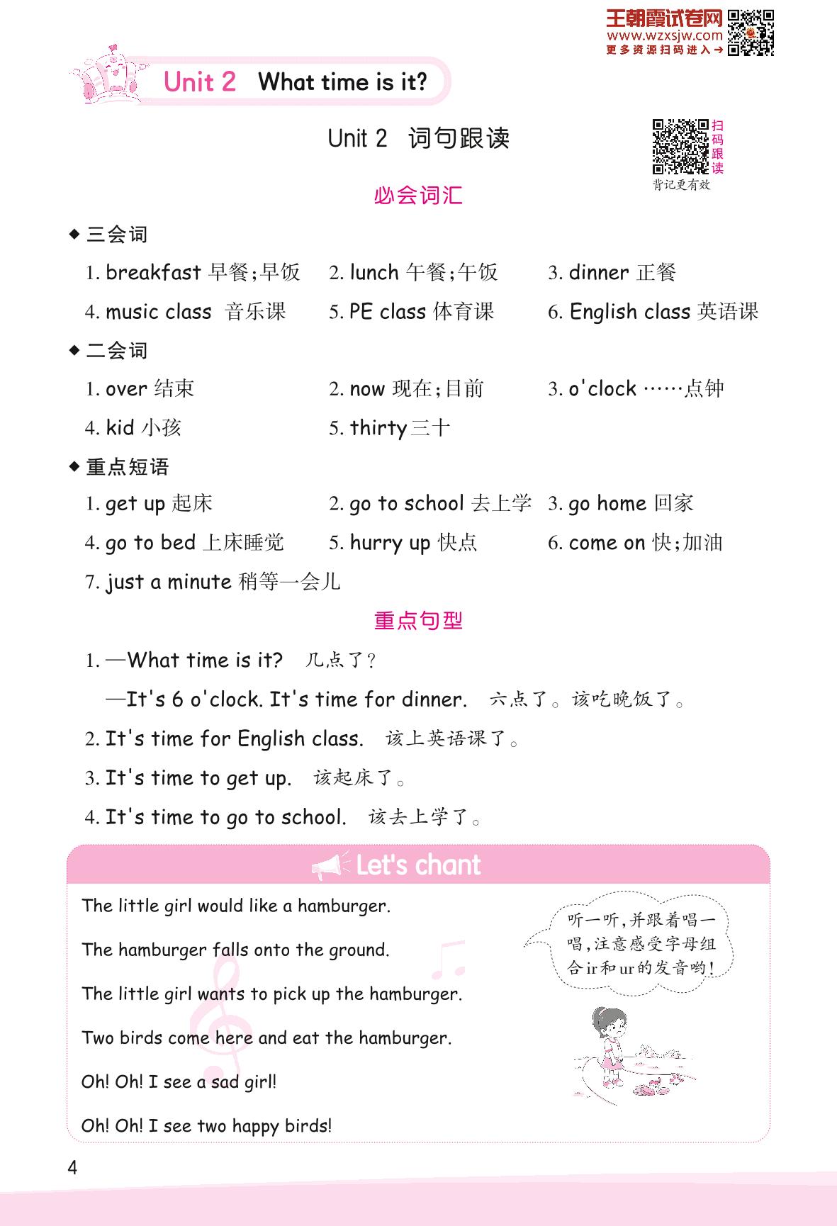2023下册四年级英语人教PEP版 Unit 2 What time is it?—词句跟读
