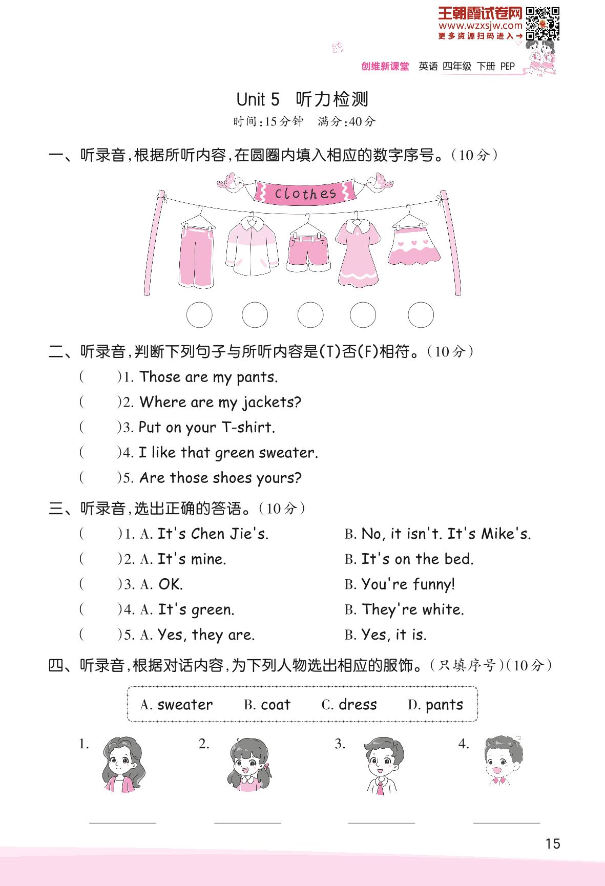 2023下册四年级英语人教PEP版 Unit 5 My clothes—听力检测