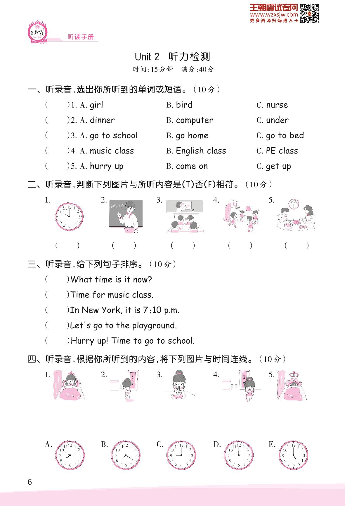 2023下册四年级英语人教PEP版 Unit 2 What time is it?—听力检测