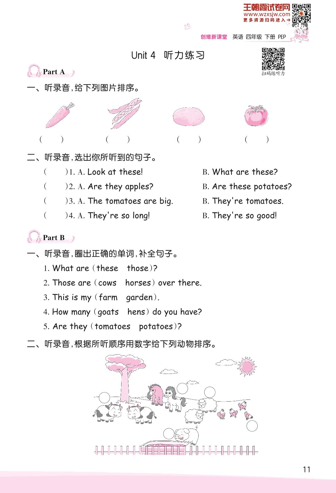 2023下册四年级英语人教PEP版 Unit 4 At the farm—Part A、Part B 听力练习