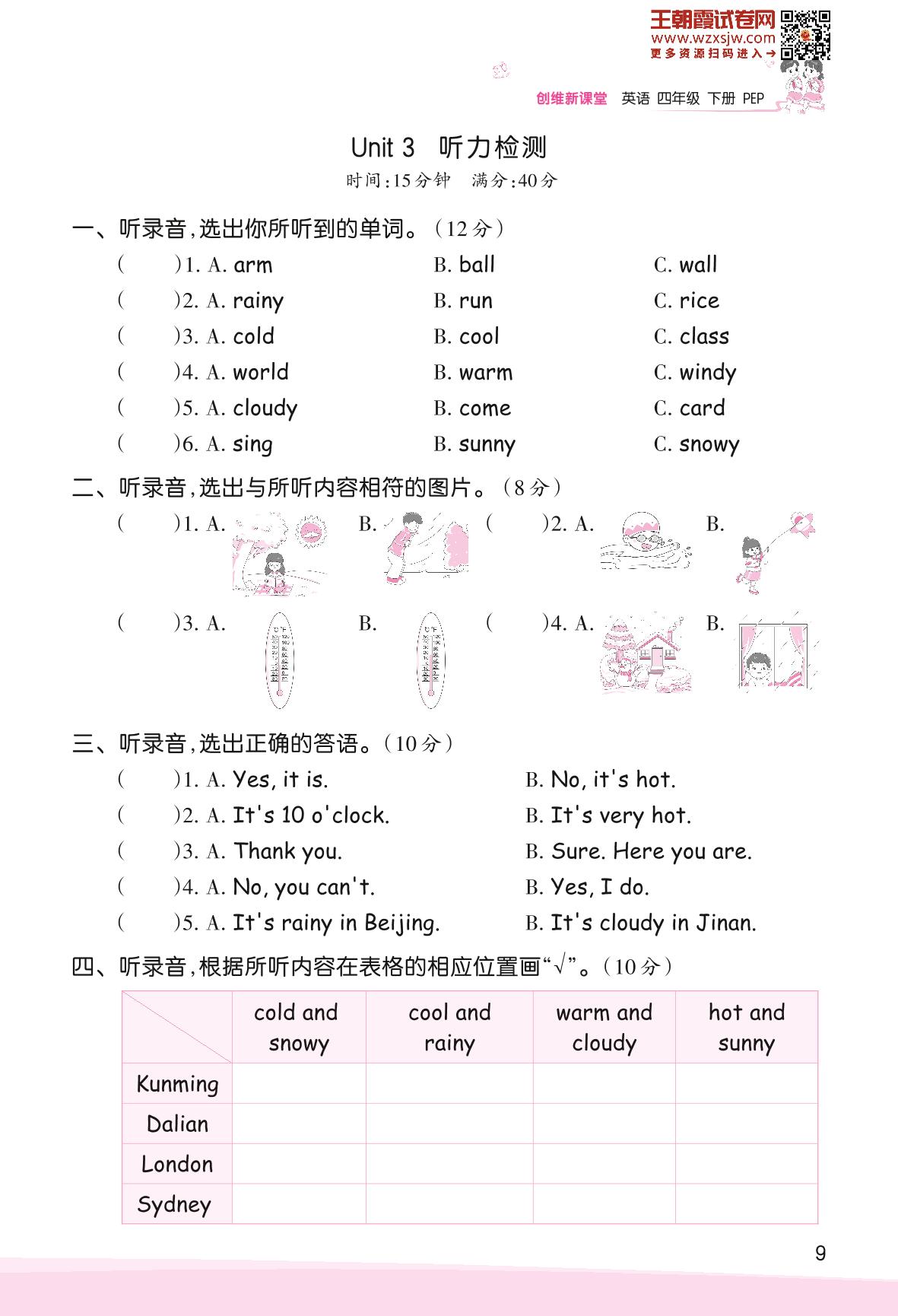 2023下册四年级英语人教PEP版 Unit 3 Weather—听力检测