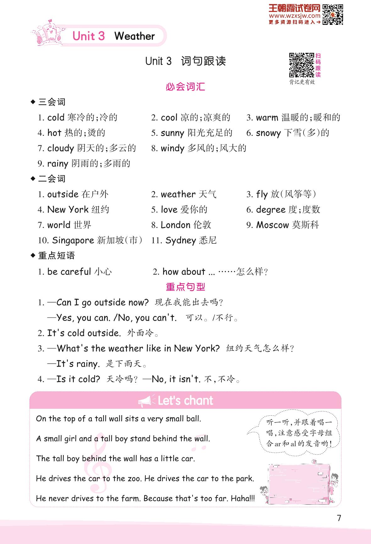 2023下册四年级英语人教PEP版 Unit 3 Weather—词句跟读