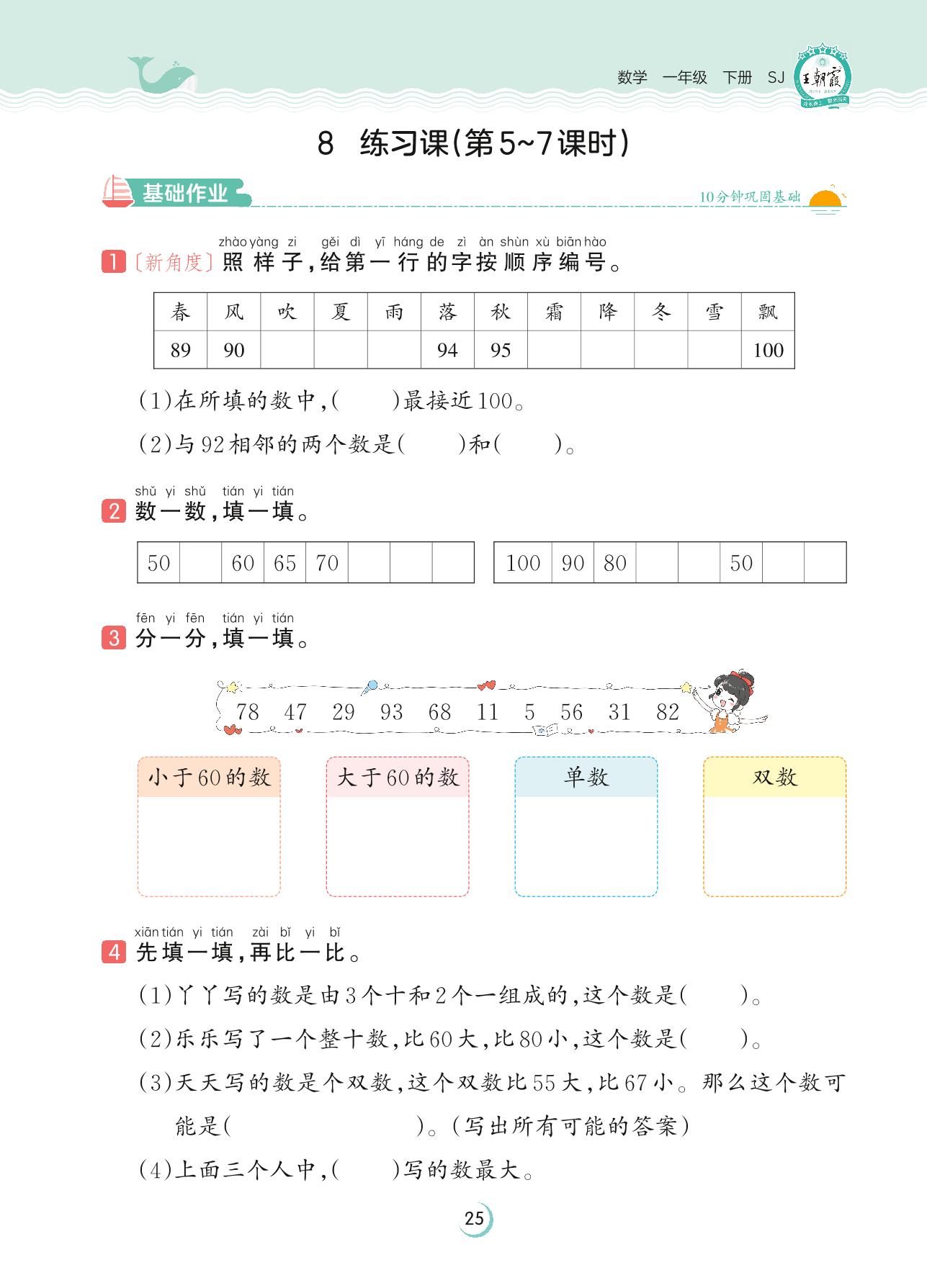 2023下册一年级数学苏教版 第三单元 认识100以内的数——8 练习课(第5~7课时)