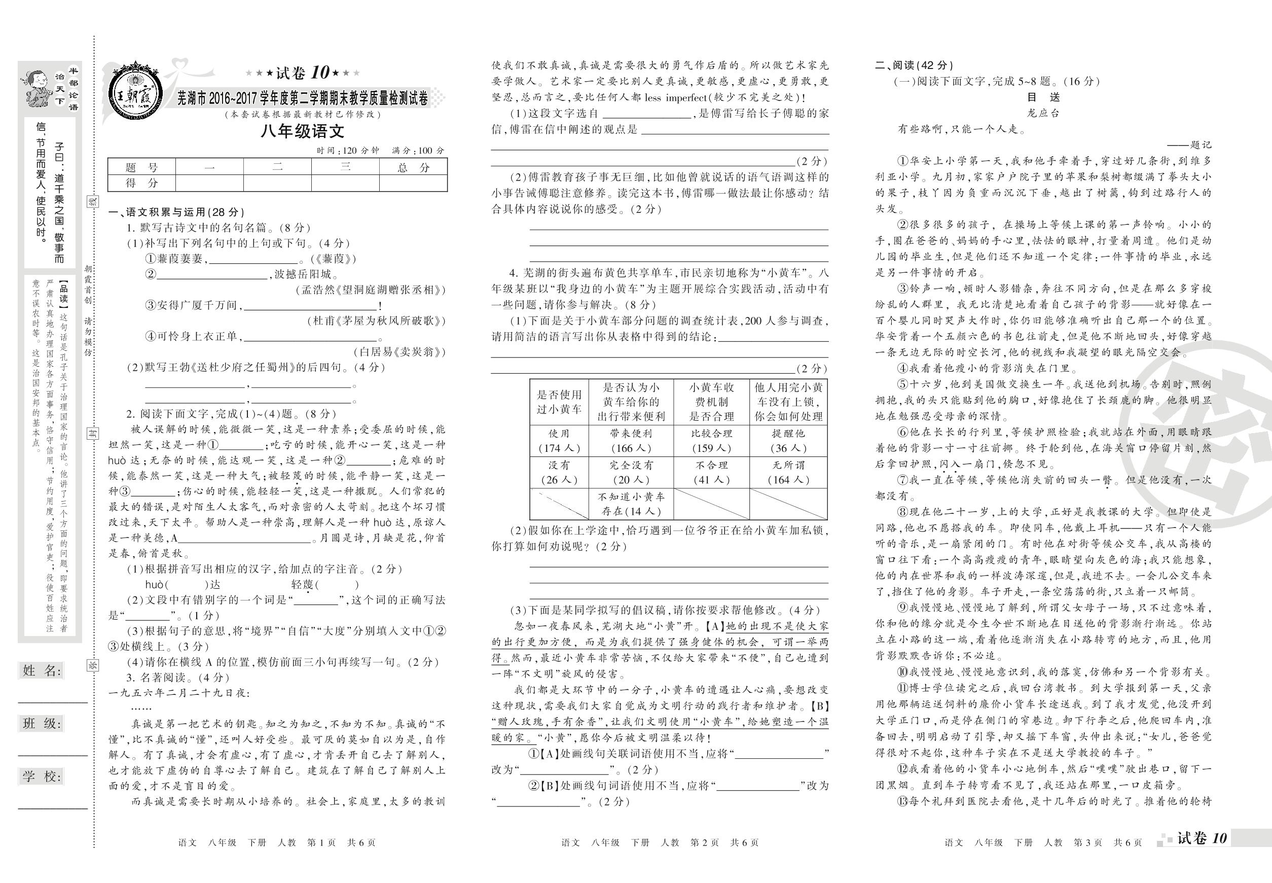 2016-2017学年第二学期芜湖市八年级语文试卷(人教版)【10】