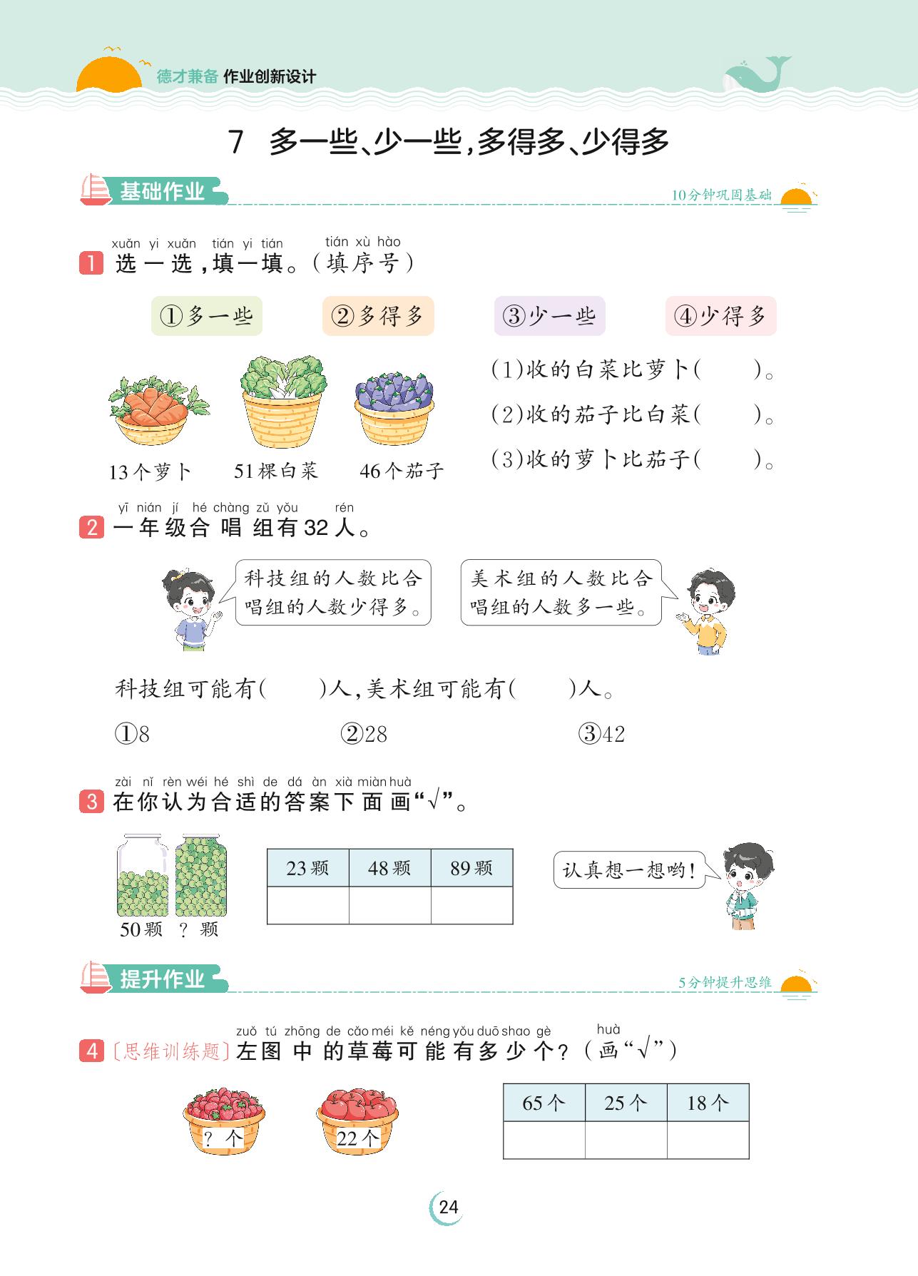 2023下册一年级数学苏教版 第三单元 认识100以内的数——7 多一些、少一些,多得多、少得多