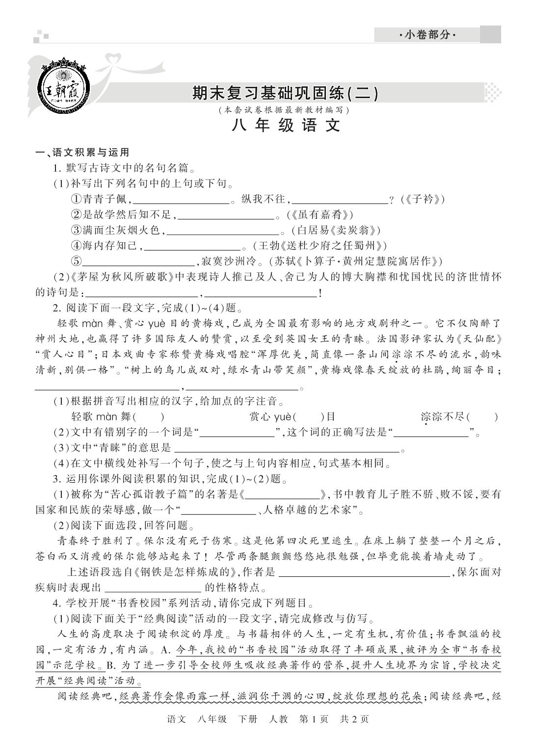 王朝霞期末小卷期末复习基础巩固练(二)一部编八语八年级下册语文(人教版)【0】